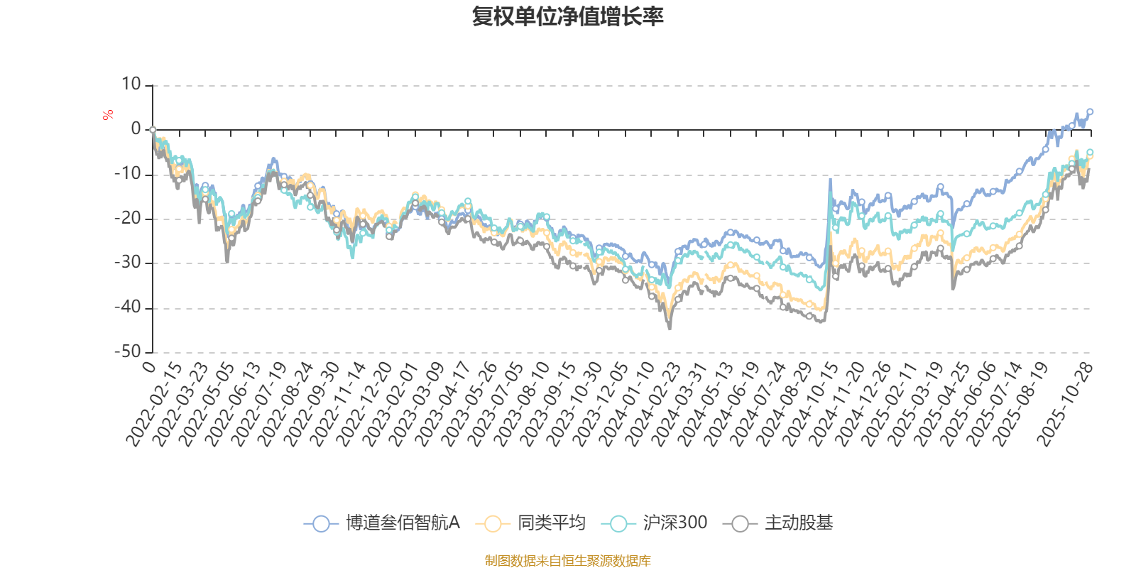 截至10月28日,博道叁佰智航A近三个月复权单位净值增长率为11.27%,位于同类可比基金114/167;近半年复权单位净值增长率为25.04%,位于同类可比基金108/166;近一年复权单位净值增长率为24.55%,位于同类可比基金100/164;近三年复权单位净值增长率为37.99%,位于同类可比基金50/156。