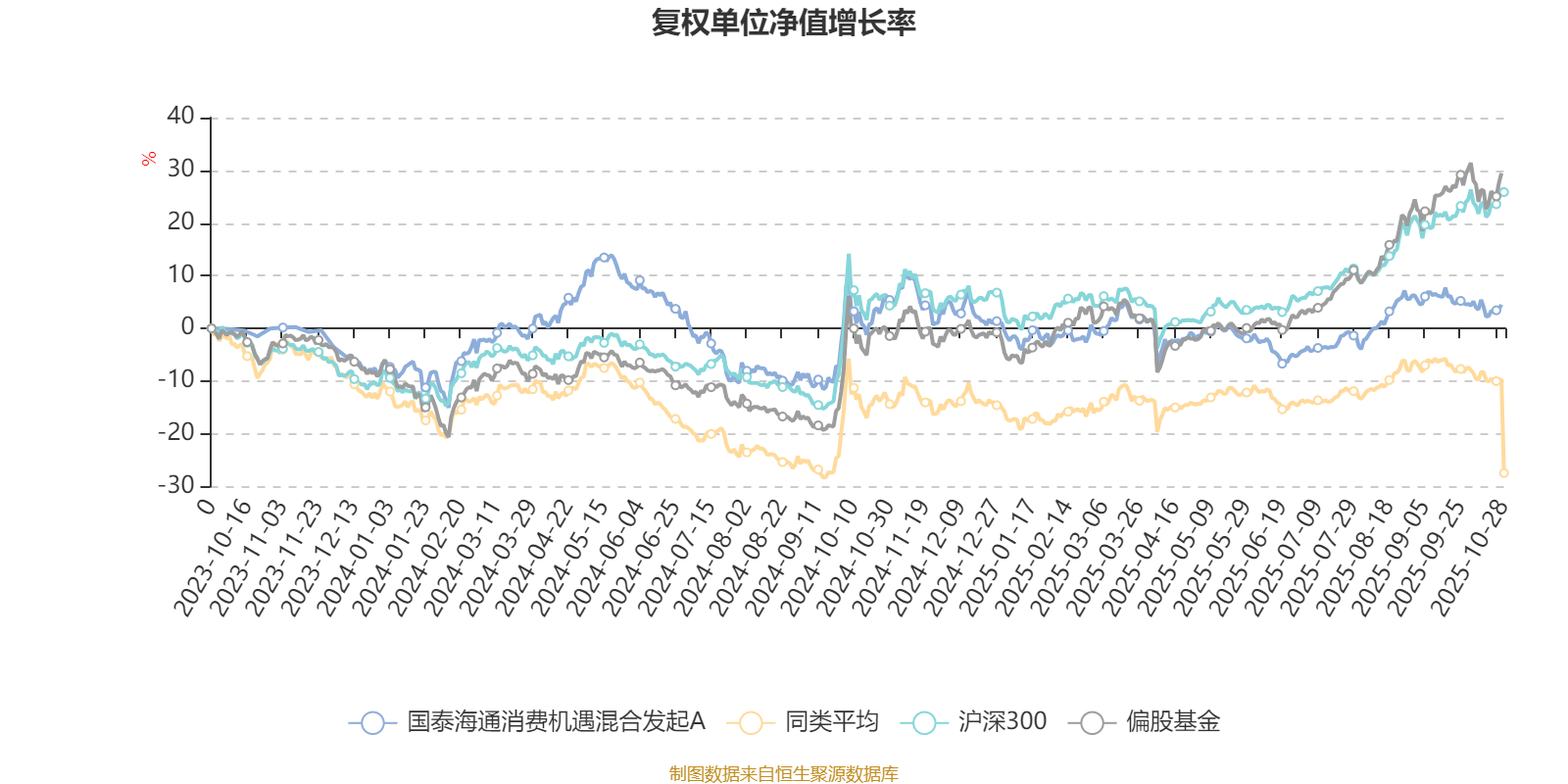 截至10月27日,国泰海通消费机遇混合发起A近三个月复权单位净值增长率为5.14%,位于同类可比基金20/85;近半年复权单位净值增长率为5.71%,位于同类可比基金40/85;近一年复权单位净值增长率为0.30%,位于同类可比基金60/82。