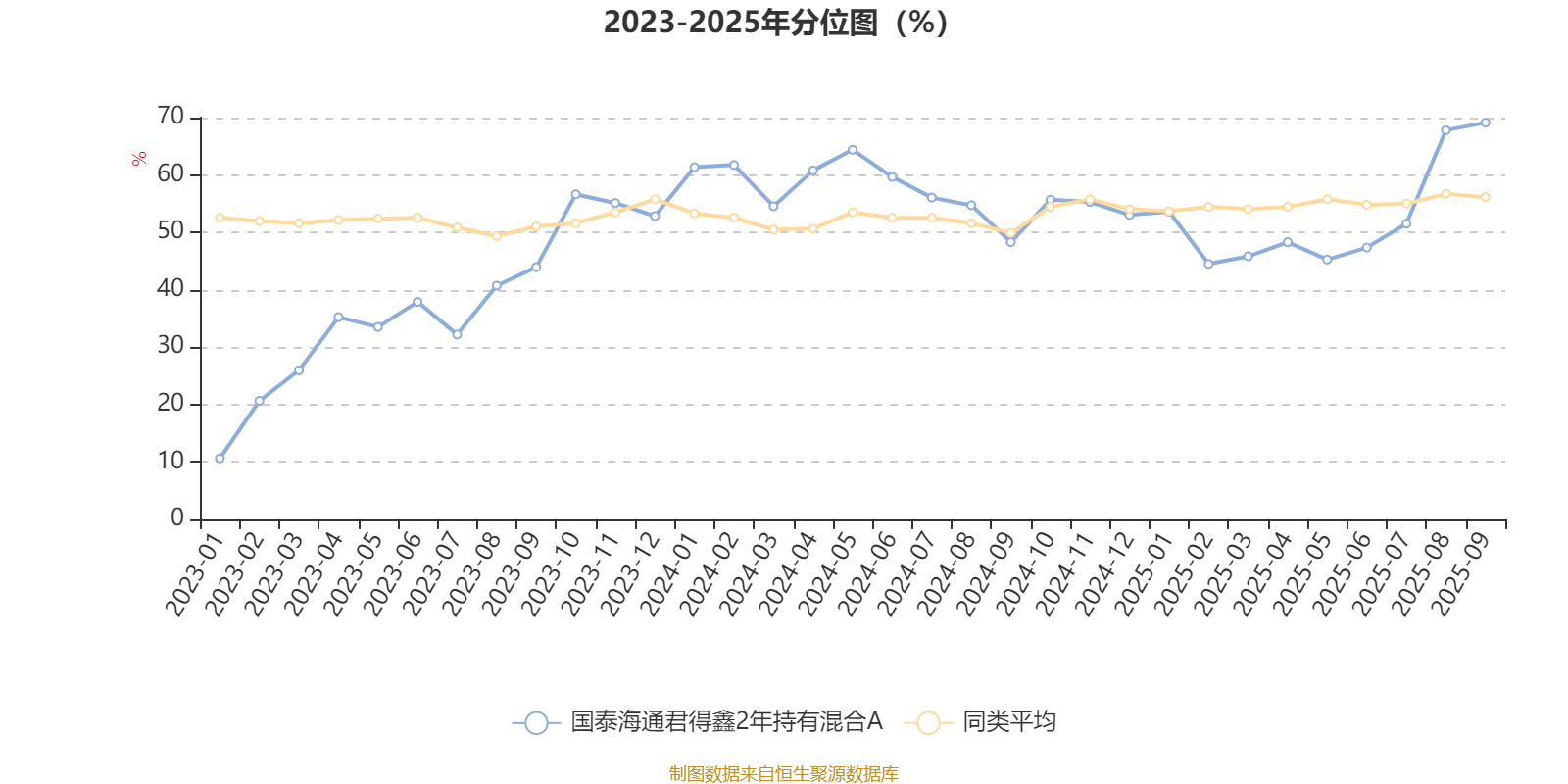 截至10月27日,国泰海通君得鑫2年持有混合A近三个月复权单位净值增长率为30.13%,位于同类可比基金77/621;近半年复权单位净值增长率为45.09%,位于同类可比基金109/619;近一年复权单位净值增长率为43.17%,位于同类可比基金149/611;近三年复权单位净值增长率为32.75%,位于同类可比基金149/518。