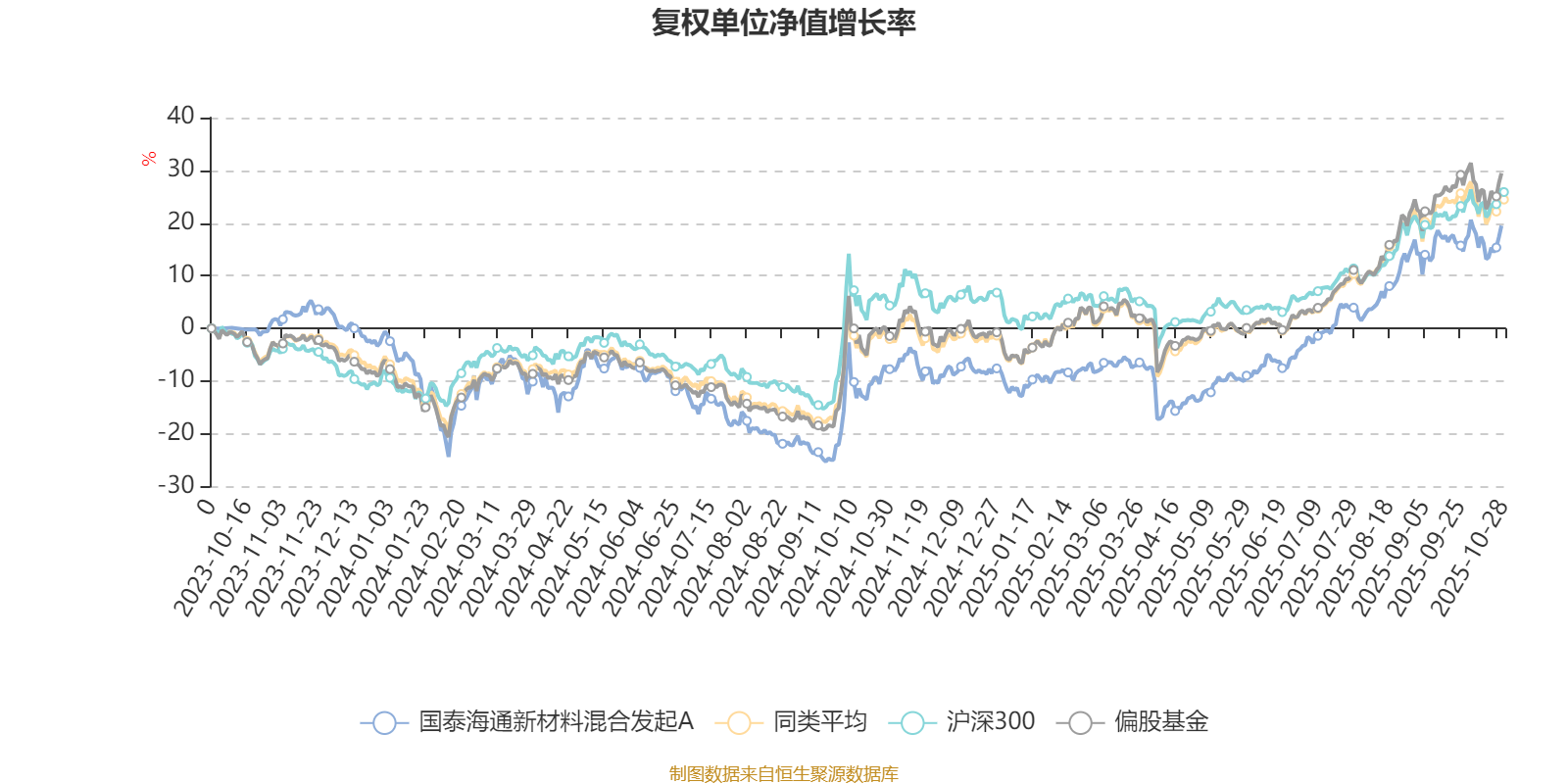 截至10月27日,国泰海通新材料混合发起A近三个月复权单位净值增长率为14.94%,位于同类可比基金299/689;近半年复权单位净值增长率为36.93%,位于同类可比基金204/688;近一年复权单位净值增长率为30.51%,位于同类可比基金261/653。