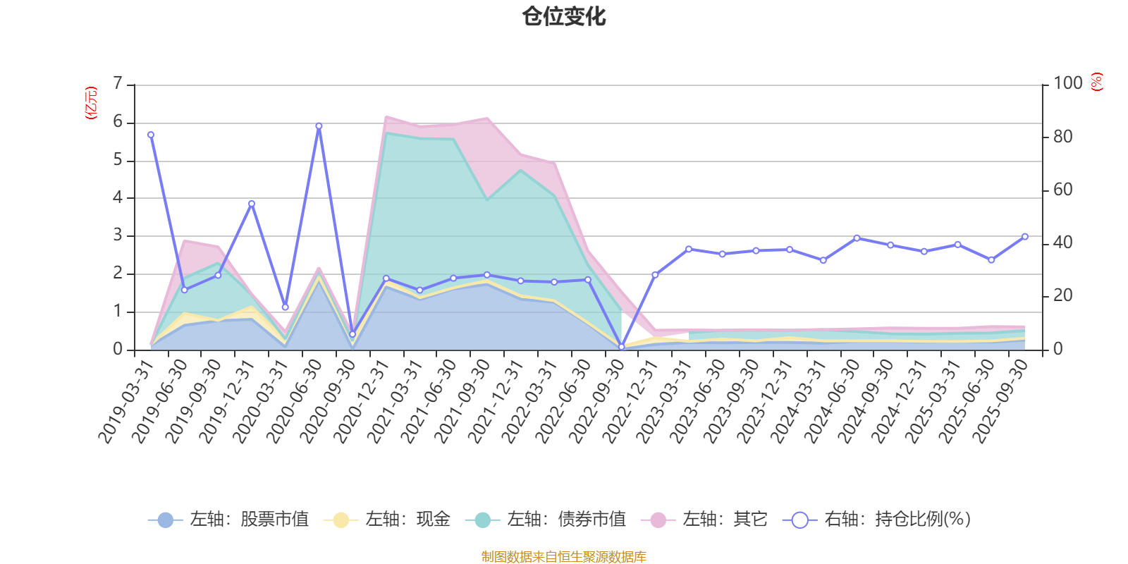 据定期报告数据统计,近三年平均股票仓位为37.25%,同类平均为72.35%。2020年上半年末基金达到84.42%的最高仓位,2022年三季度末最低,为1.2%。