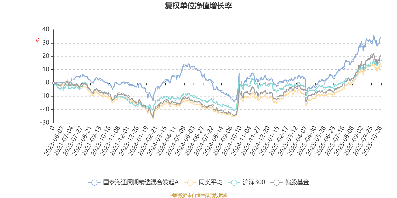 截至10月27日,国泰海通周期精选混合发起A近三个月复权单位净值增长率为15.94%,位于同类可比基金275/689;近半年复权单位净值增长率为37.45%,位于同类可比基金192/688;近一年复权单位净值增长率为31.29%,位于同类可比基金249/653。