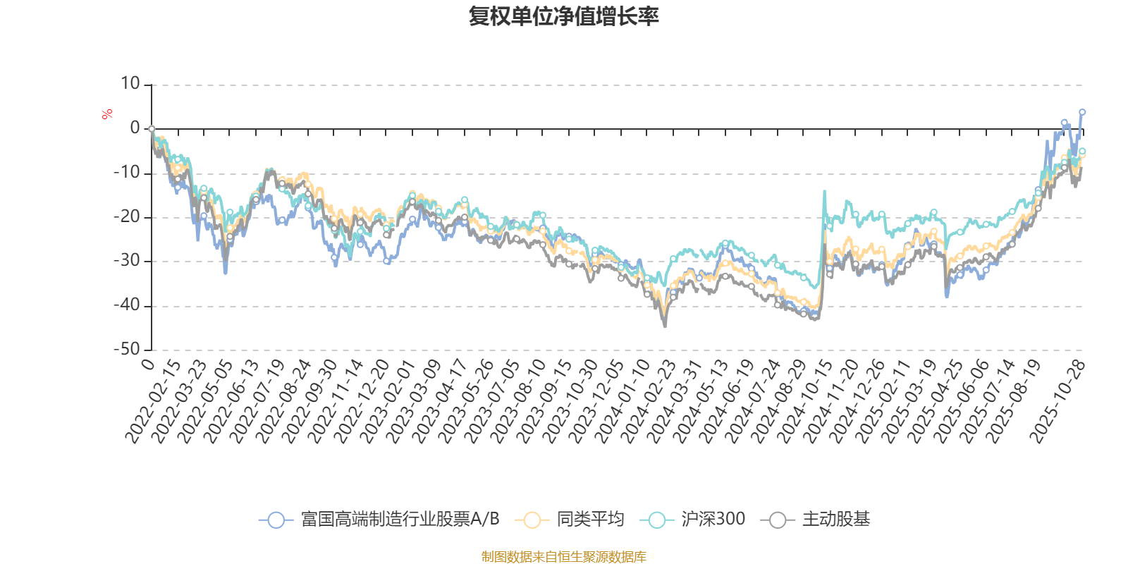 截至10月28日,富国高端制造行业股票A/B近三个月复权单位净值增长率为32.00%,位于同类可比基金15/167;近半年复权单位净值增长率为56.78%,位于同类可比基金12/166;近一年复权单位净值增长率为47.61%,位于同类可比基金23/164;近三年复权单位净值增长率为46.25%,位于同类可比基金36/156。