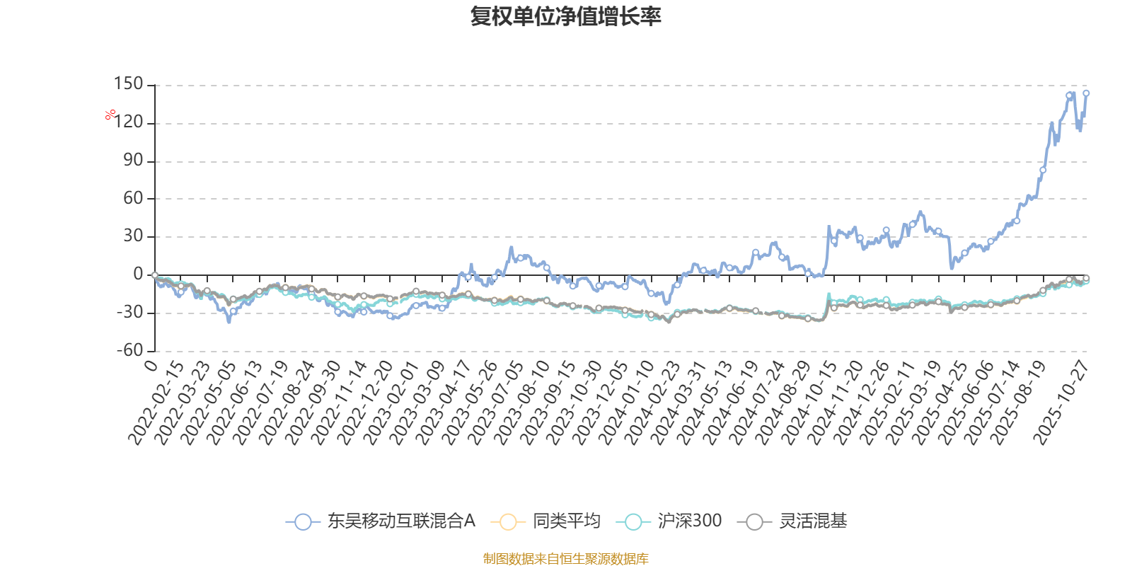 截至10月27日,东吴移动互联混合A近三个月复权单位净值增长率为55.82%,位于同类可比基金26/1287;近半年复权单位净值增长率为107.14%,位于同类可比基金15/1287;近一年复权单位净值增长率为81.30%,位于同类可比基金37/1287;近三年复权单位净值增长率为254.68%,位于同类可比基金1/1286。