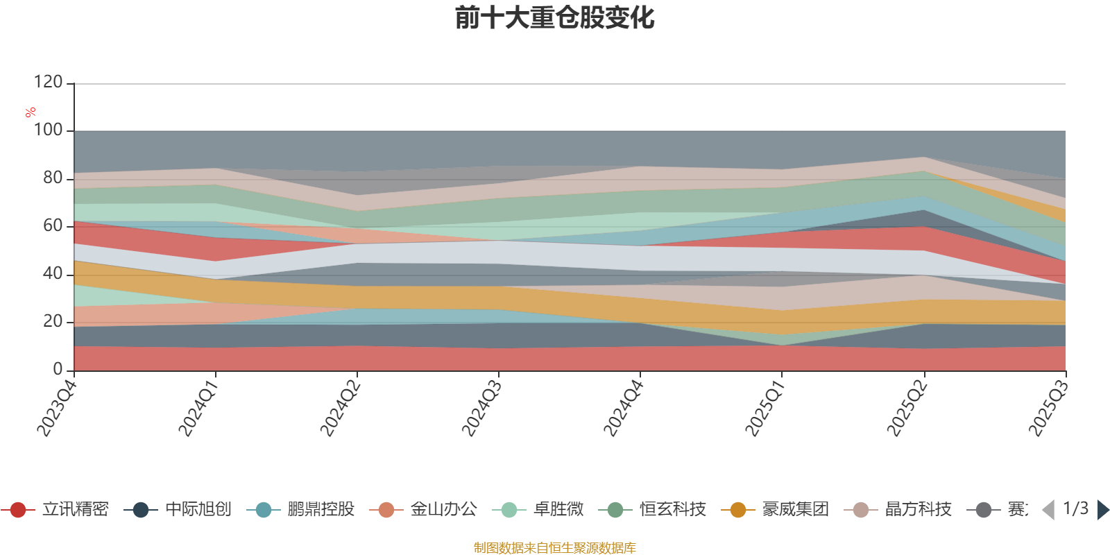 该基金持股集中度较高,近2年前十大重仓股集中度长期超过60%。截至2025年三季度末,基金十大重仓股分别是豪威集团、立讯精密、新易盛、德赛西威、中际旭创、兆易创新、歌尔股份、拓普集团、瑞芯微、水晶光电。