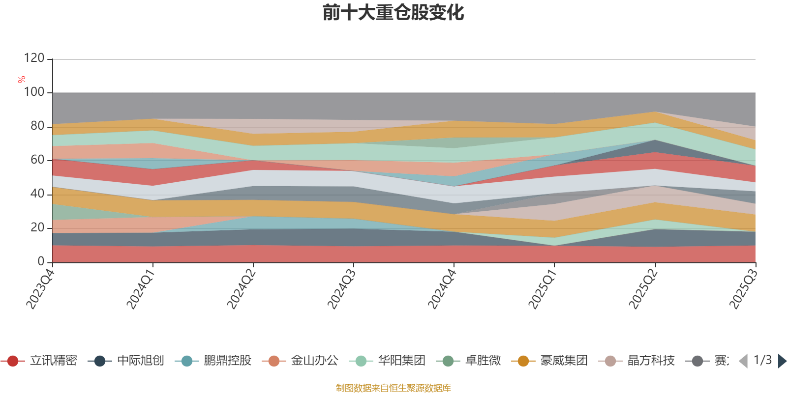该基金持股集中度较高,近2年前十大重仓股集中度长期超过60%。截至2025年三季度末,基金十大重仓股分别是豪威集团、立讯精密、德赛西威、新易盛、中际旭创、兆易创新、歌尔股份、晶方科技、沪电股份、水晶光电。
