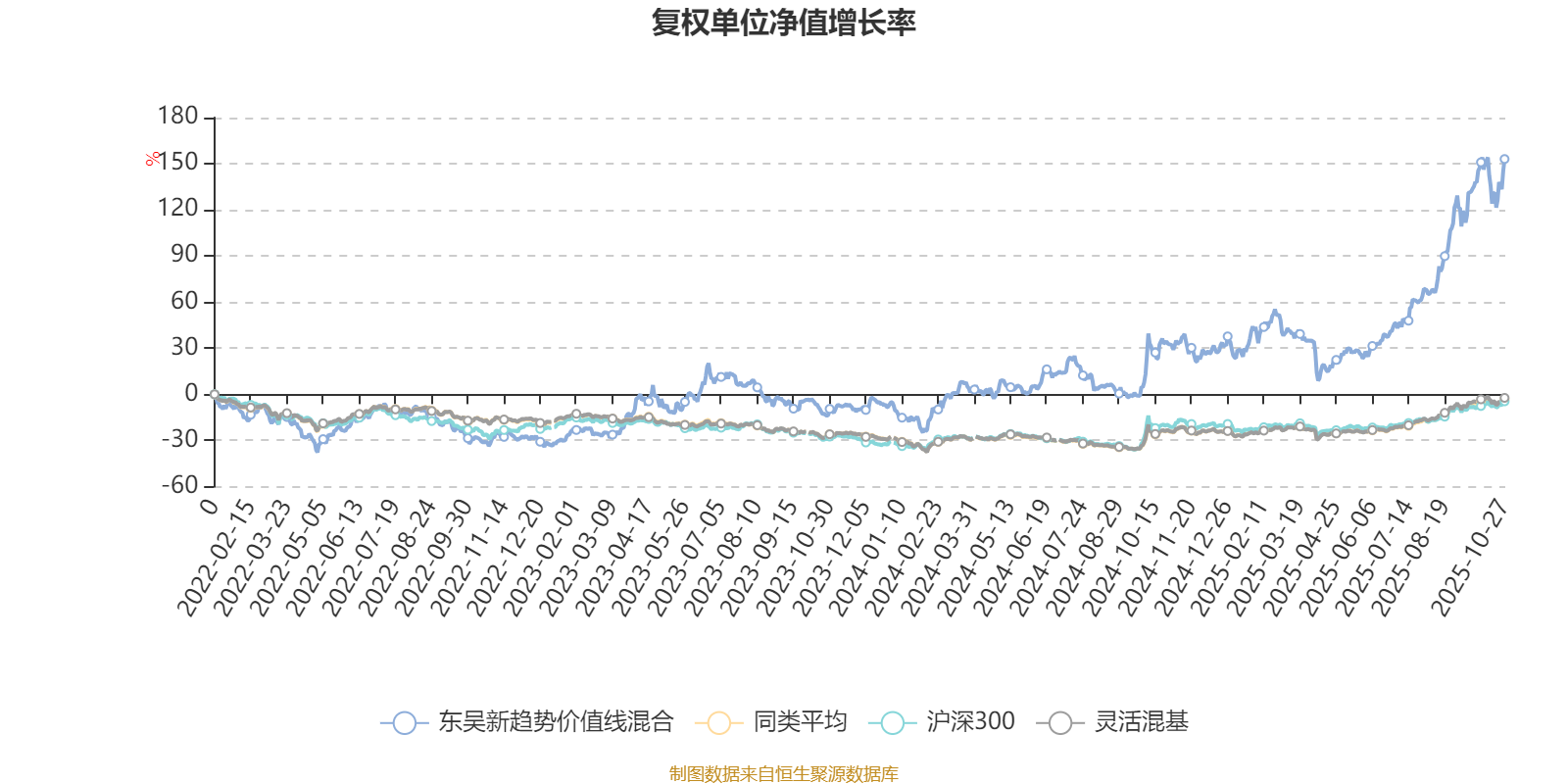 截至10月27日,东吴新趋势价值线混合近三个月复权单位净值增长率为56.83%,位于同类可比基金22/1287;近半年复权单位净值增长率为106.74%,位于同类可比基金15/1287;近一年复权单位净值增长率为88.34%,位于同类可比基金27/1287;近三年复权单位净值增长率为267.17%,位于同类可比基金1/1286。