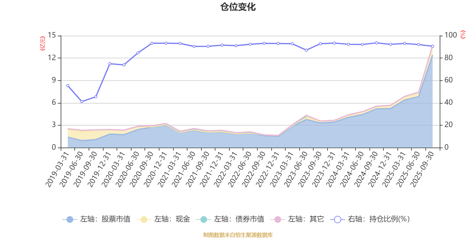 据定期报告数据统计,近三年平均股票仓位为92.11%,同类平均为72.35%。2024年三季度末基金达到93.59%的最高仓位,2019年上半年末最低,为41.19%。