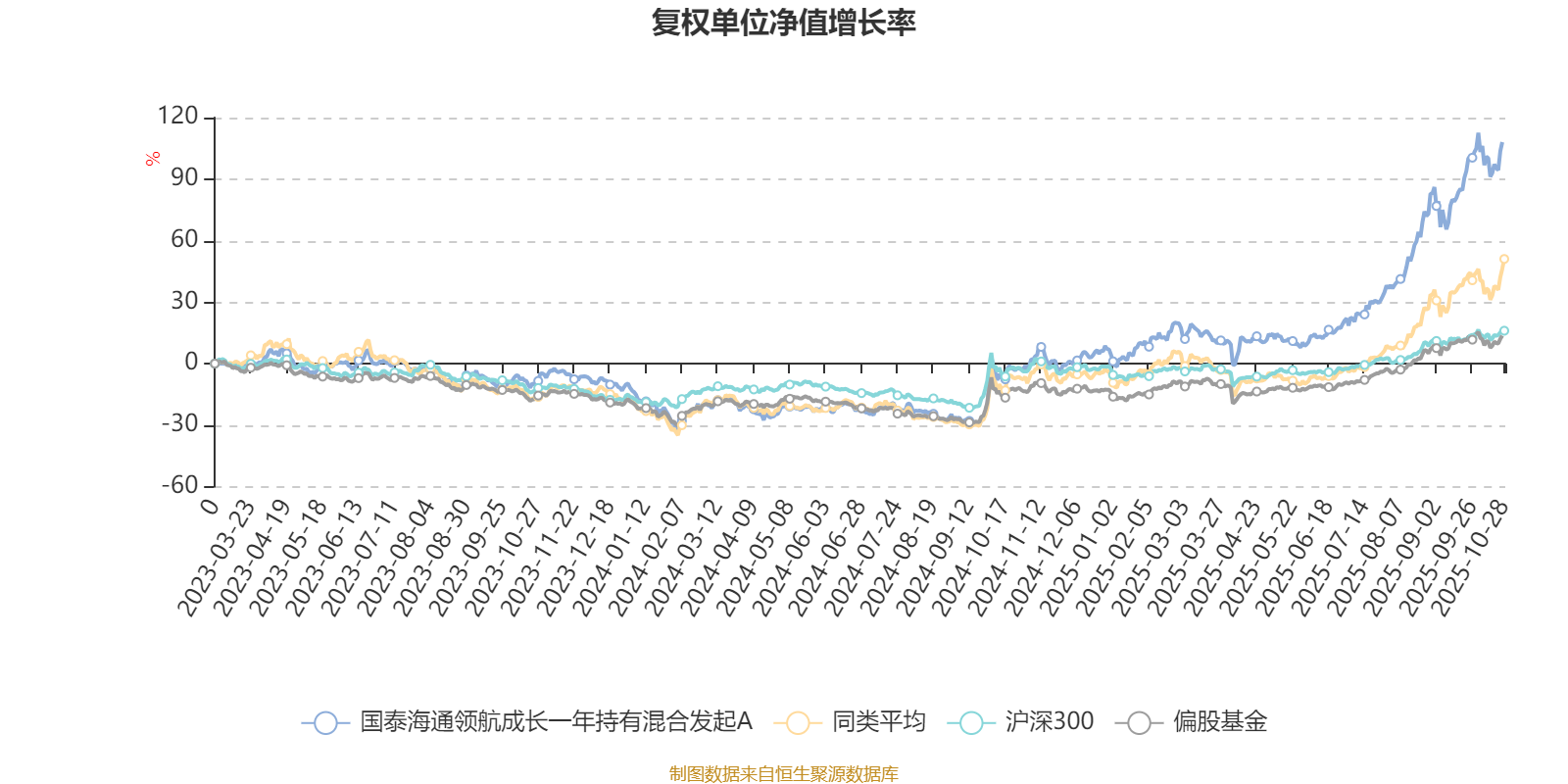 截至10月27日,国泰海通领航成长一年持有混合发起A近三个月复权单位净值增长率为56.73%,位于同类可比基金31/229;近半年复权单位净值增长率为87.26%,位于同类可比基金40/229;近一年复权单位净值增长率为112.93%,位于同类可比基金9/213。