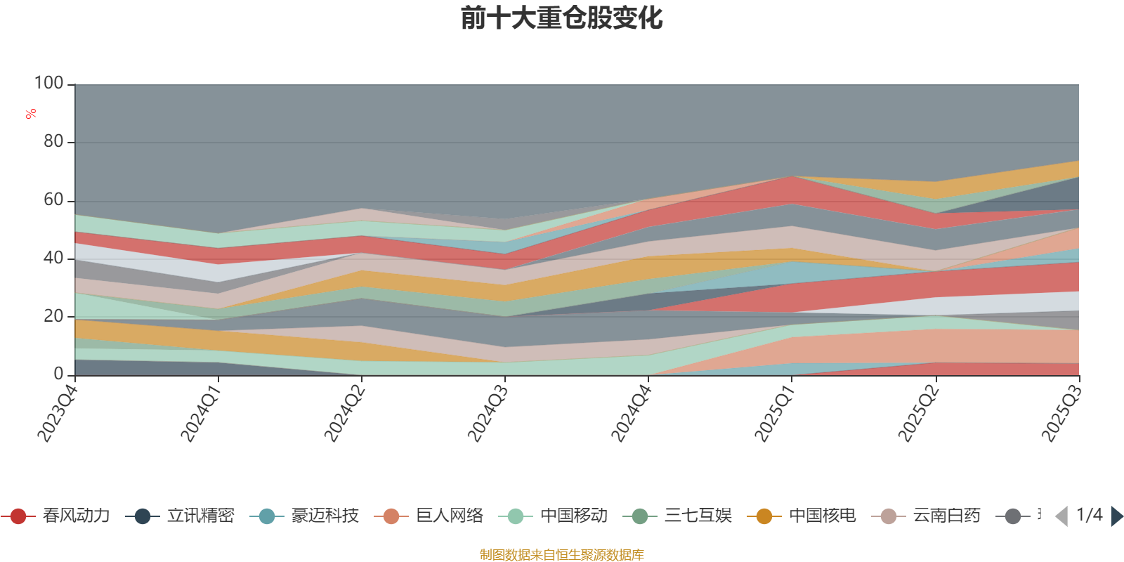 截至2025年三季度末,基金十大重仓股分别是巨人网络、科沃斯、美的集团、九号公司、环旭电子、海大集团、国光股份、华测导航、贵州茅台、春风动力。