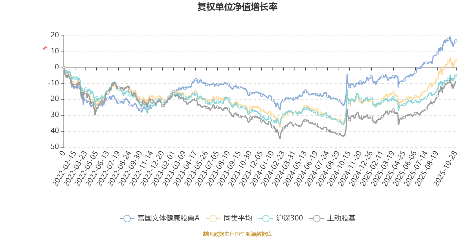 截至10月28日,富国文体健康股票A近三个月复权单位净值增长率为12.90%,位于同类可比基金39/58;近半年复权单位净值增长率为26.05%,位于同类可比基金34/57;近一年复权单位净值增长率为30.08%,位于同类可比基金25/57;近三年复权单位净值增长率为59.94%,位于同类可比基金14/56。