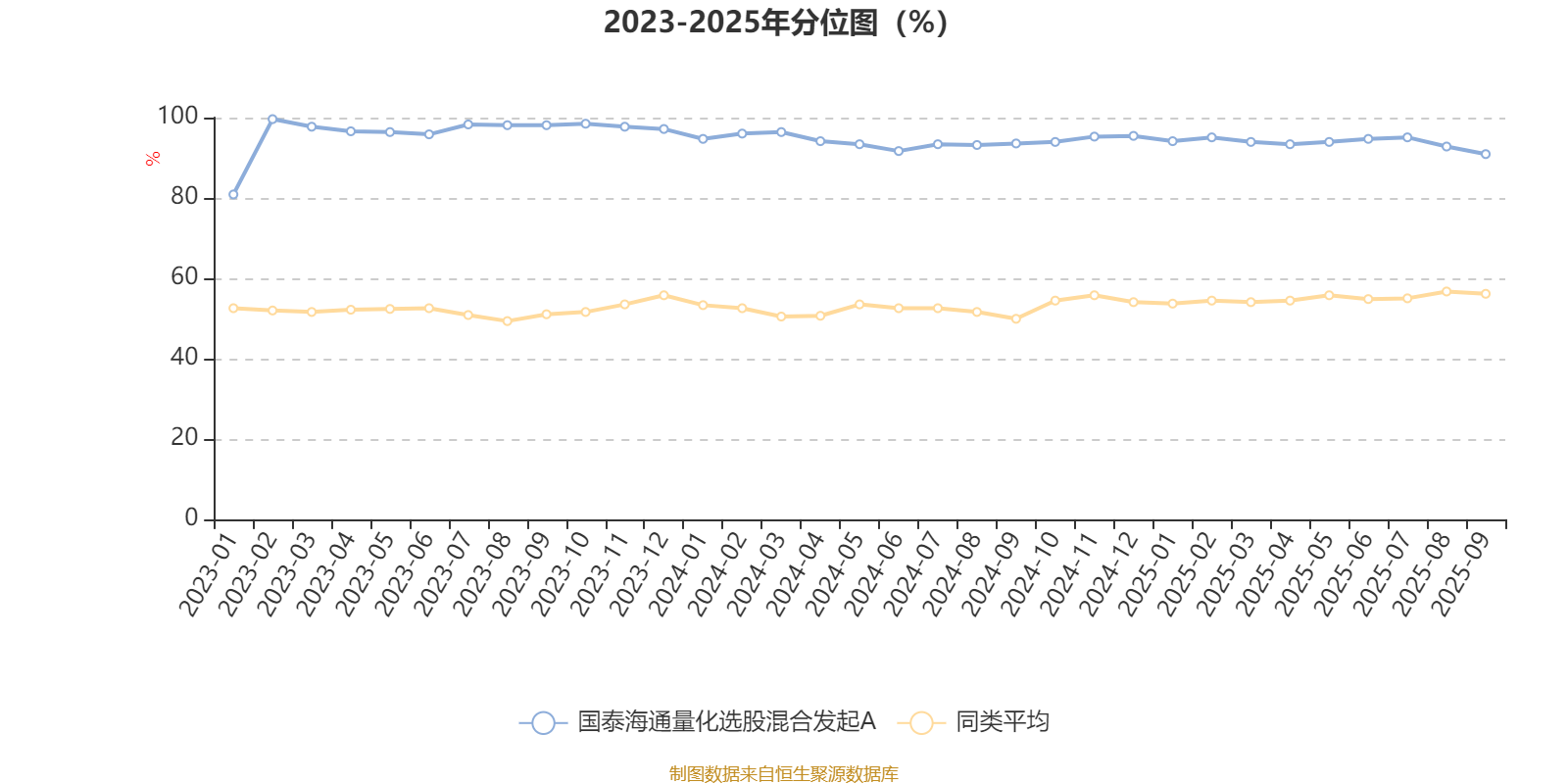 通过所选区间该基金净值增长率分位图,可以观察该基金与同类基金业绩比较情况。图为坐标原点到区间内某时点的净值增长率在同类基金中的分位数。