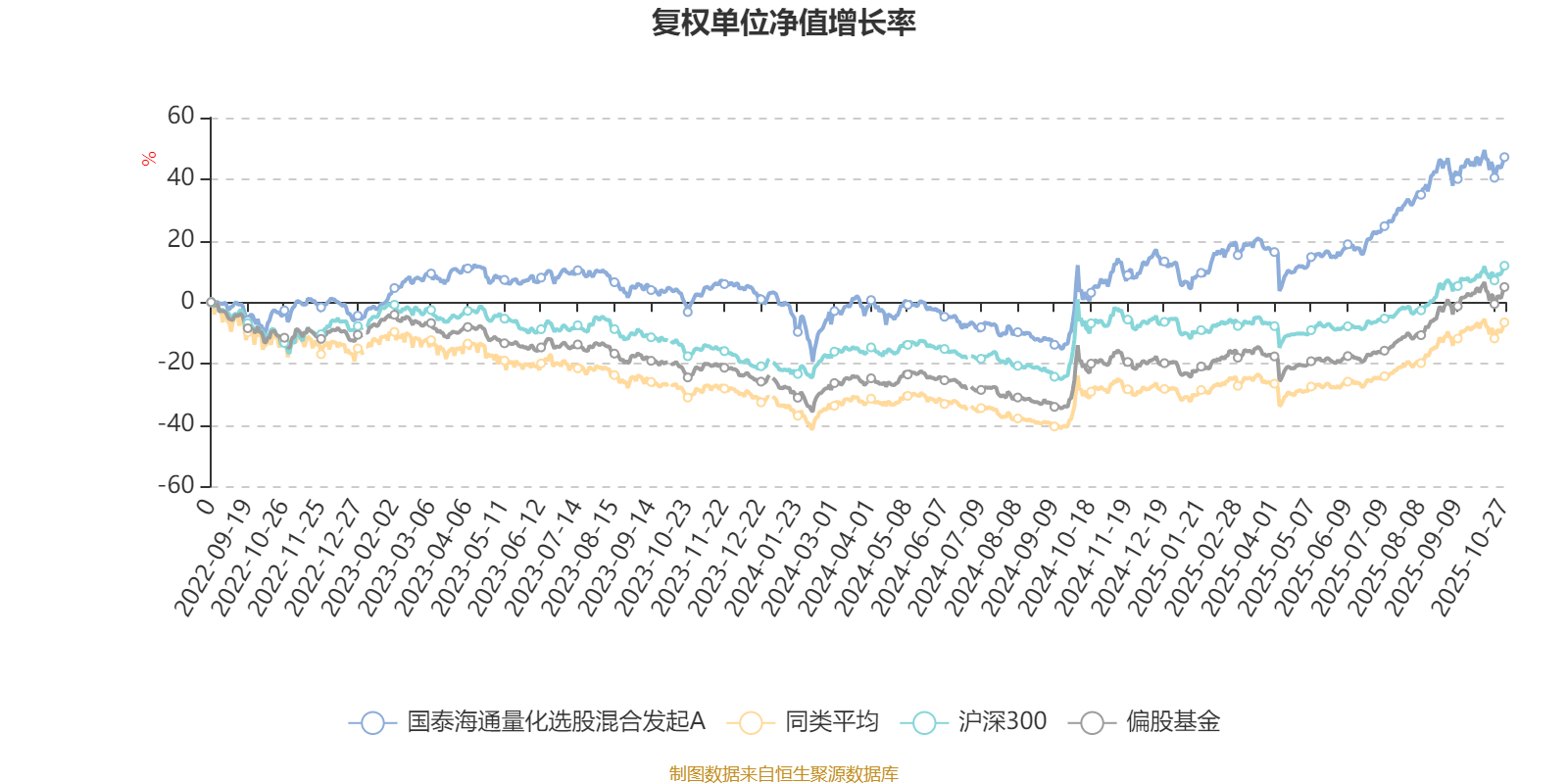 截至10月27日,国泰海通量化选股混合发起A近三个月复权单位净值增长率为11.79%,位于同类可比基金369/621;近半年复权单位净值增长率为31.69%,位于同类可比基金270/619;近一年复权单位净值增长率为38.98%,位于同类可比基金177/611;近三年复权单位净值增长率为51.73%,位于同类可比基金66/518。