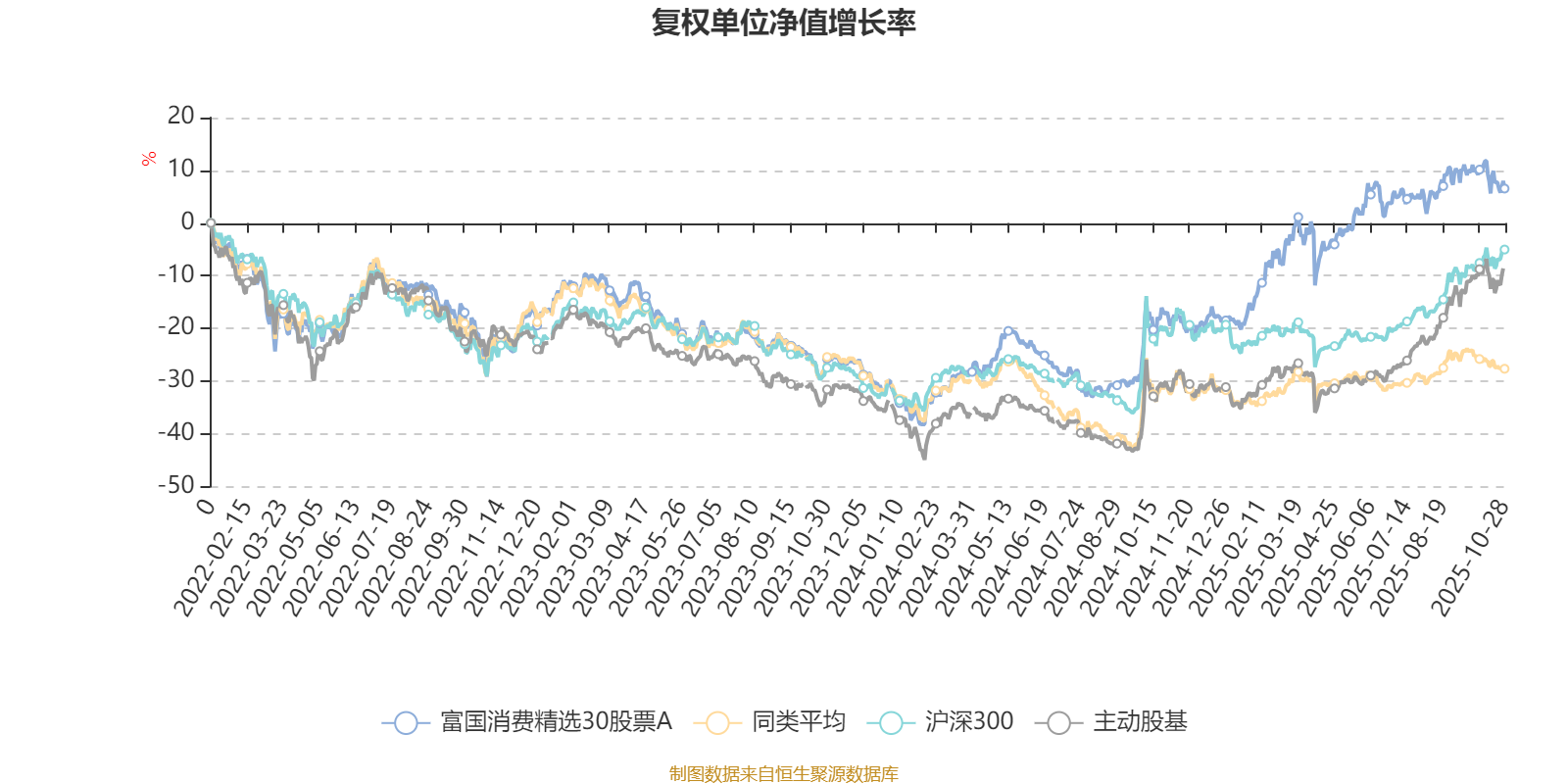 截至10月28日,富国消费精选30股票A近三个月复权单位净值增长率为1.50%,位于同类可比基金24/43;近半年复权单位净值增长率为9.81%,位于同类可比基金11/43;近一年复权单位净值增长率为28.53%,位于同类可比基金1/43;近三年复权单位净值增长率为47.47%,位于同类可比基金1/40。