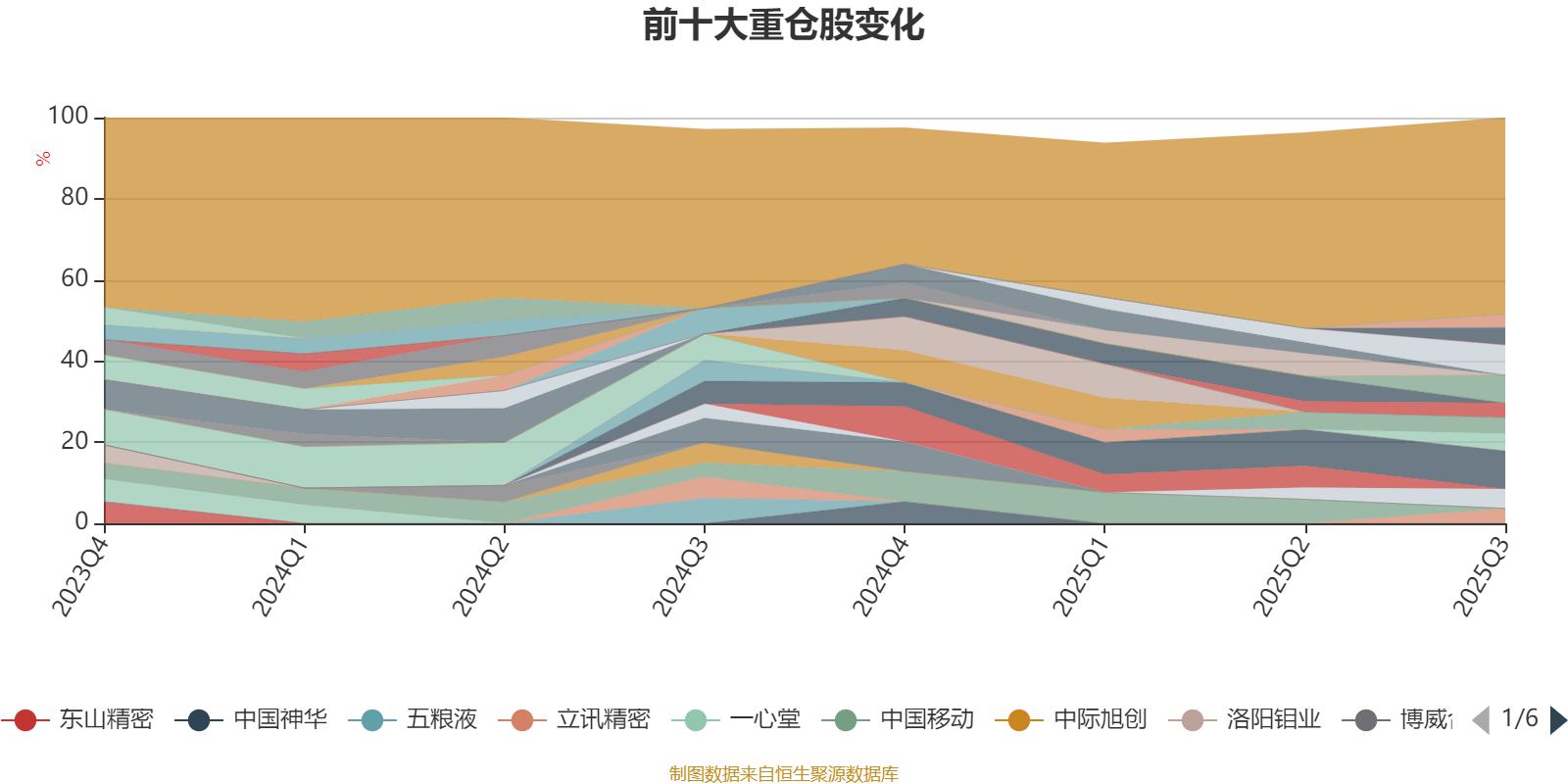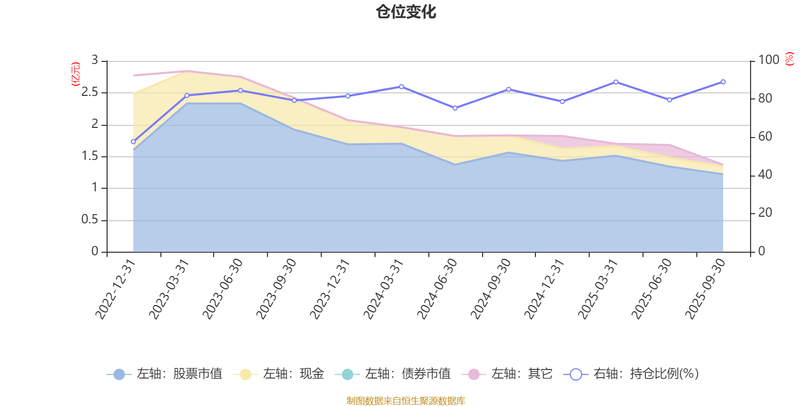 据定期报告数据统计,近三年平均股票仓位为80.71%,同类平均为85.66%。2025年三季度末基金达到89.05%的最高仓位,2022年末最低,为57.72%。