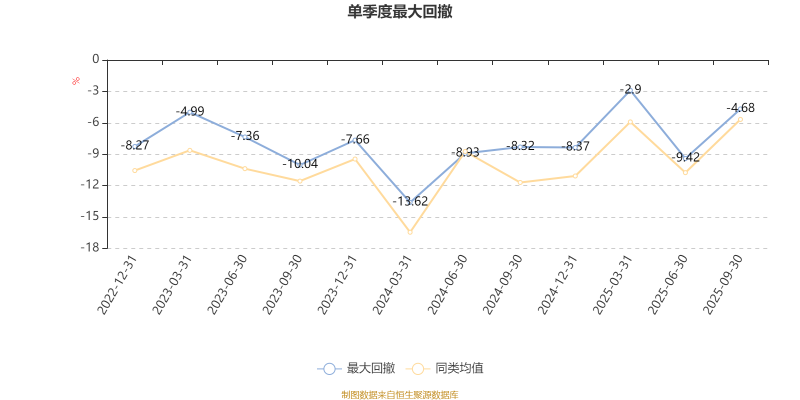 截至10月27日,基金近三年最大回撤为31.49%,同类可比基金排名161/513。单季度最大回撤出现在2024年一季度,为13.62%。