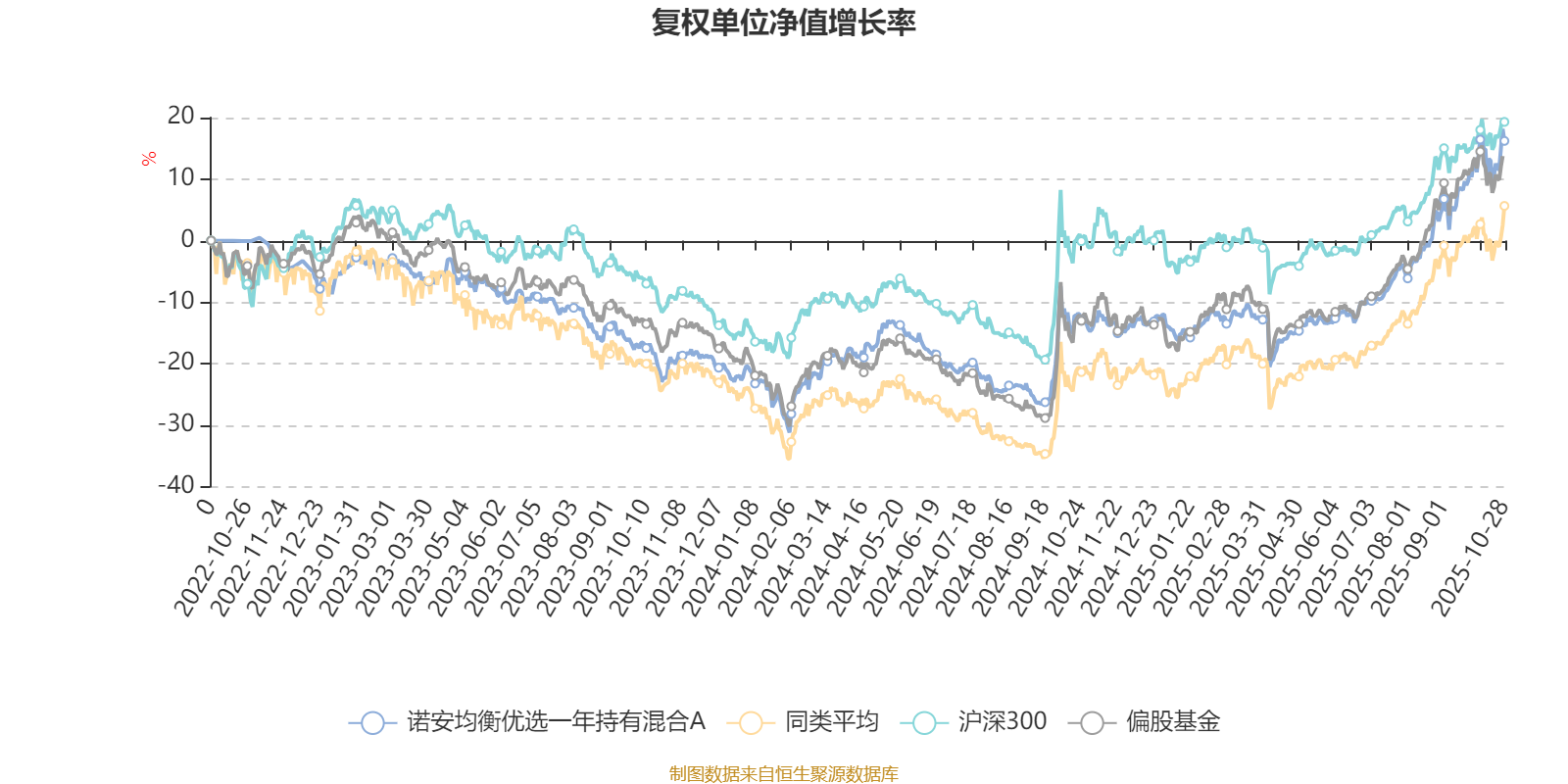 截至10月28日,诺安均衡优选一年持有混合A近三个月复权单位净值增长率为21.25%,位于同类可比基金173/621;近半年复权单位净值增长率为36.67%,位于同类可比基金188/619;近一年复权单位净值增长率为33.48%,位于同类可比基金247/611;近三年复权单位净值增长率为16.32%,位于同类可比基金266/518。