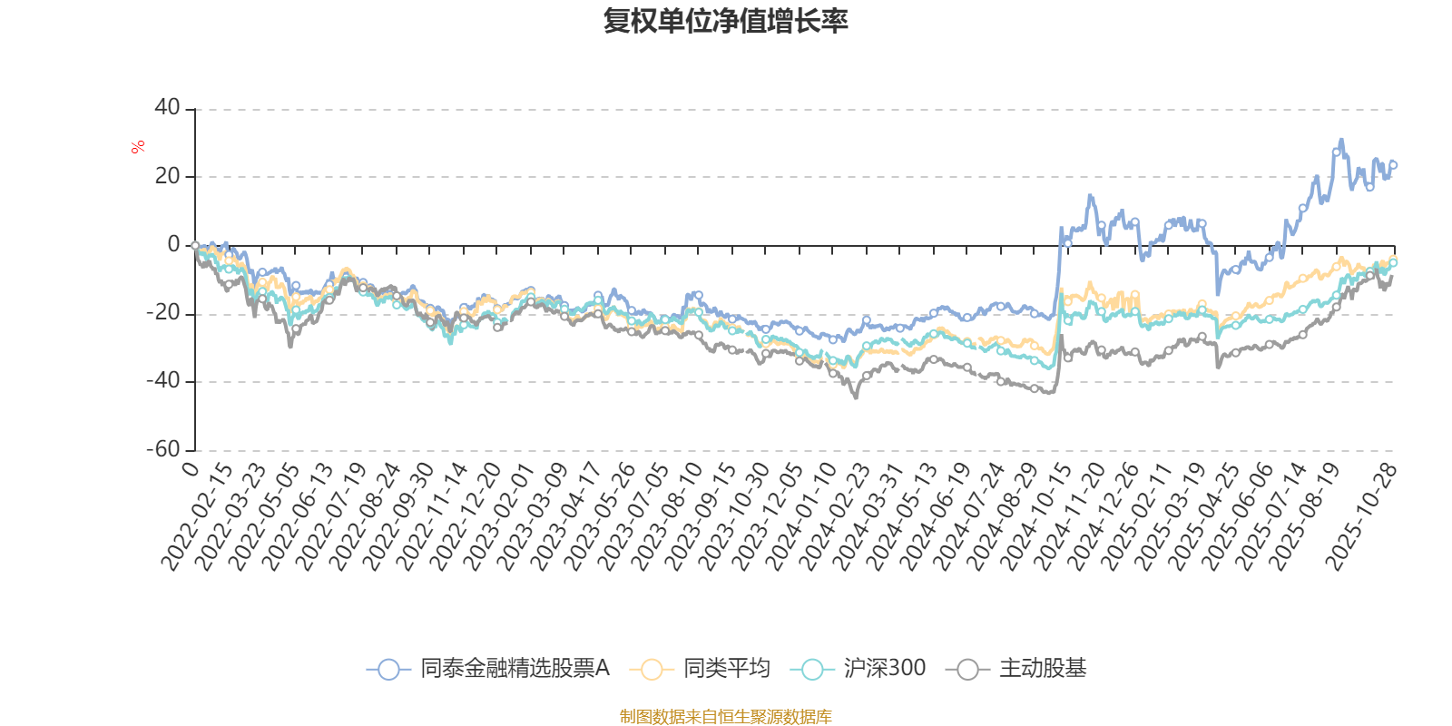 截至10月28日,同泰金融精选股票A近三个月复权单位净值增长率为3.49%,位于同类可比基金2/6;近半年复权单位净值增长率为34.32%,位于同类可比基金1/6;近一年复权单位净值增长率为17.55%,位于同类可比基金3/5;近三年复权单位净值增长率为59.30%,位于同类可比基金2/5。