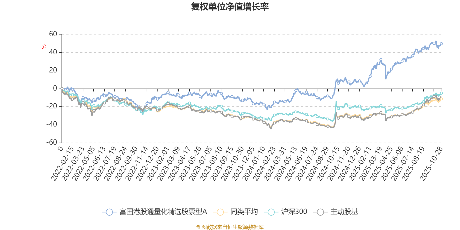 截至10月28日,富国港股通量化精选股票型A近三个月复权单位净值增长率为4.53%,位于同类可比基金94/121;近半年复权单位净值增长率为23.07%,位于同类可比基金76/121;近一年复权单位净值增长率为37.31%,位于同类可比基金31/115;近三年复权单位净值增长率为103.81%,位于同类可比基金1/87。