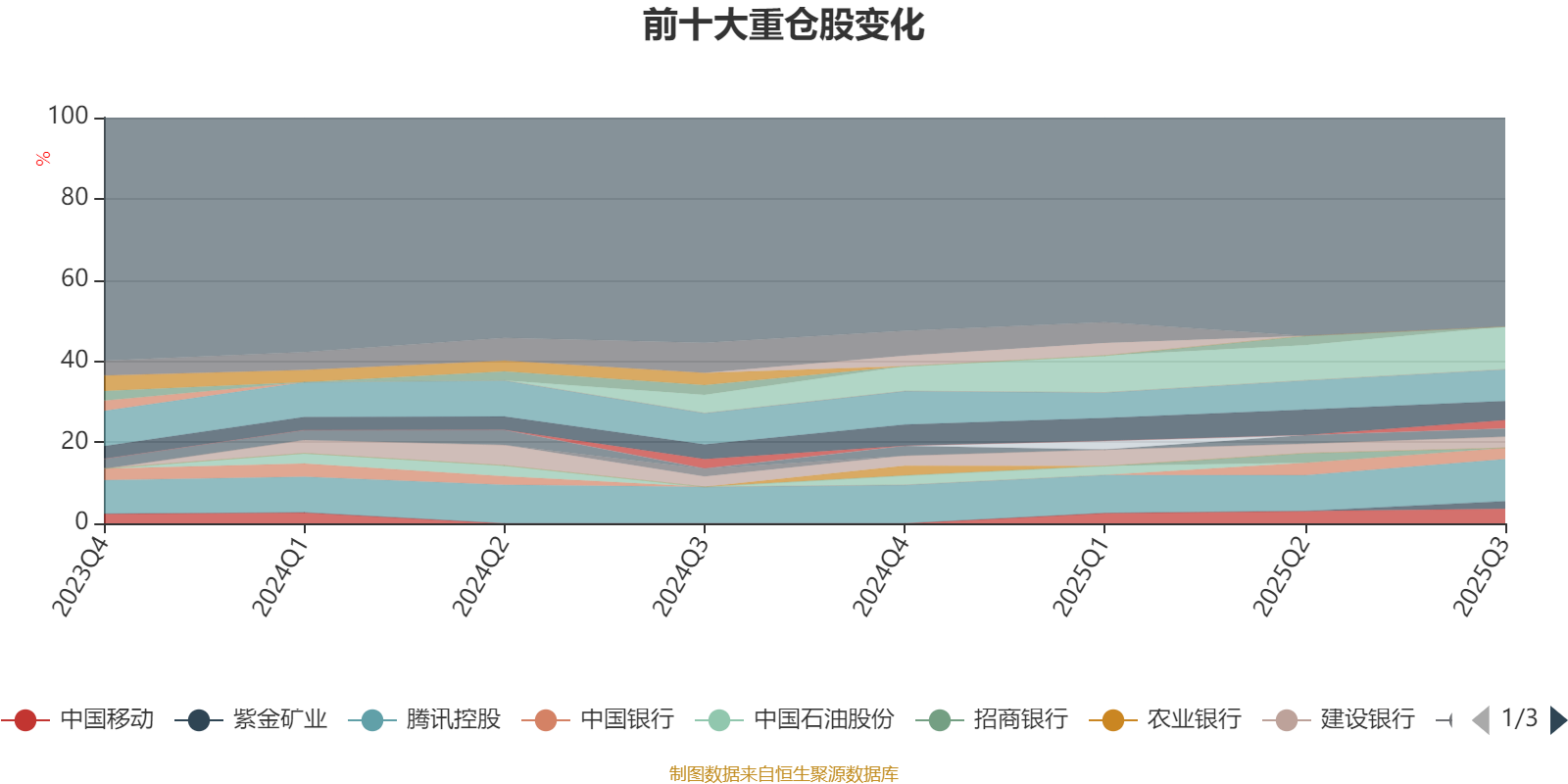 截至2025年三季度末,基金十大重仓股分别是阿里巴巴-W、腾讯控股、汇丰控股、小米集团-W、中国移动、建设银行、中国银行、中国人寿、中国海洋石油、紫金矿业。