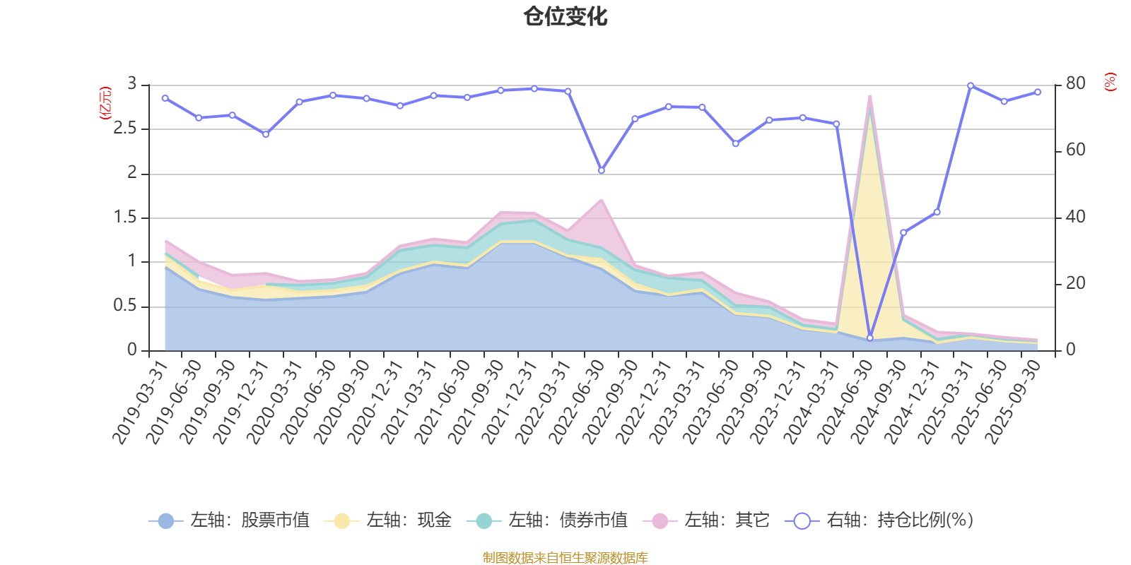 据定期报告数据统计,近三年平均股票仓位为60.85%,同类平均为67.37%。2025年一季度末基金达到79.71%的最高仓位,2024年上半年末最低,为3.83%。