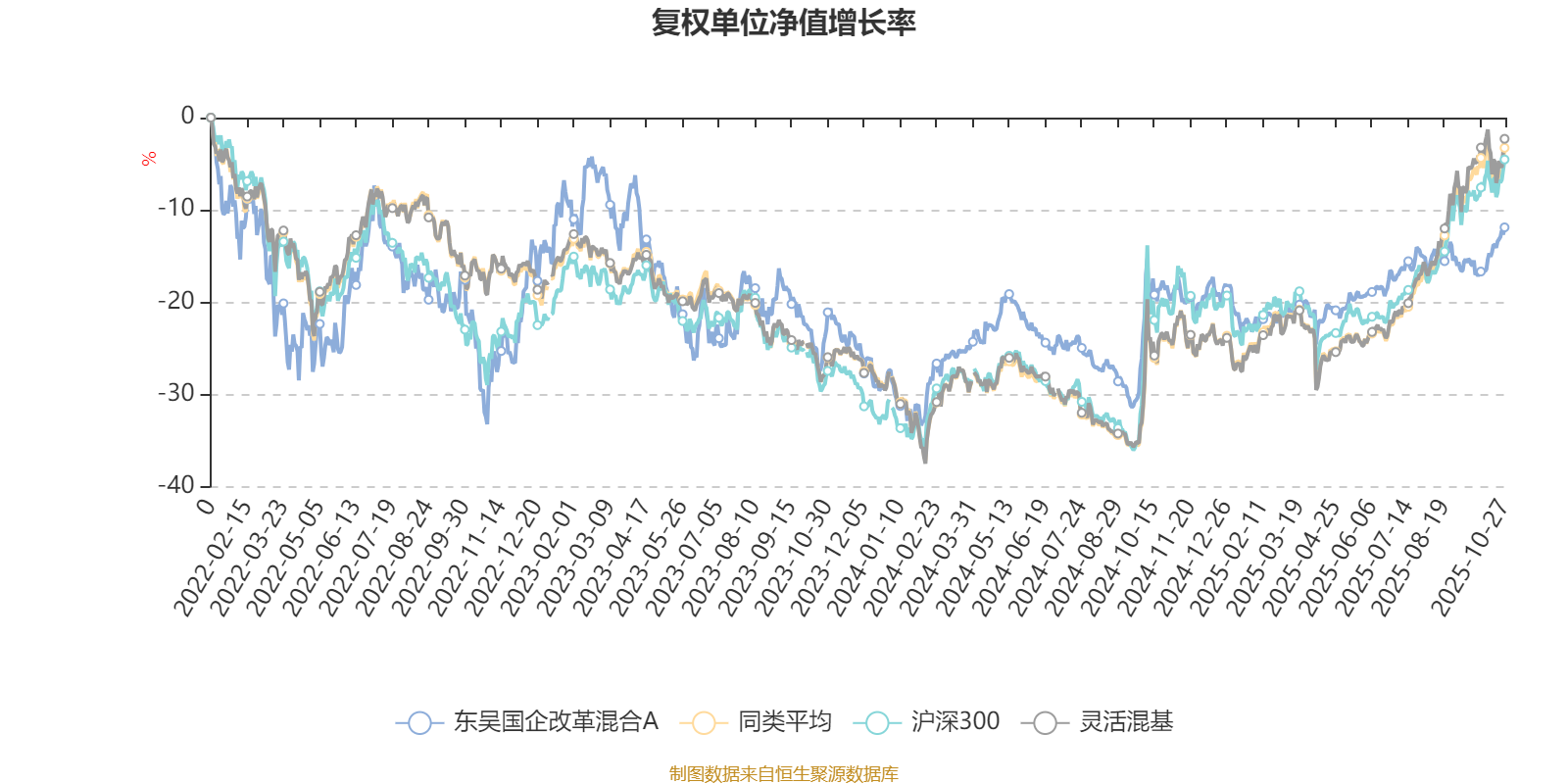 截至10月27日,东吴国企改革混合A近三个月复权单位净值增长率为3.56%,位于同类可比基金1009/1287;近半年复权单位净值增长率为11.37%,位于同类可比基金994/1287;近一年复权单位净值增长率为8.30%,位于同类可比基金1008/1287;近三年复权单位净值增长率为29.41%,位于同类可比基金361/1286。
