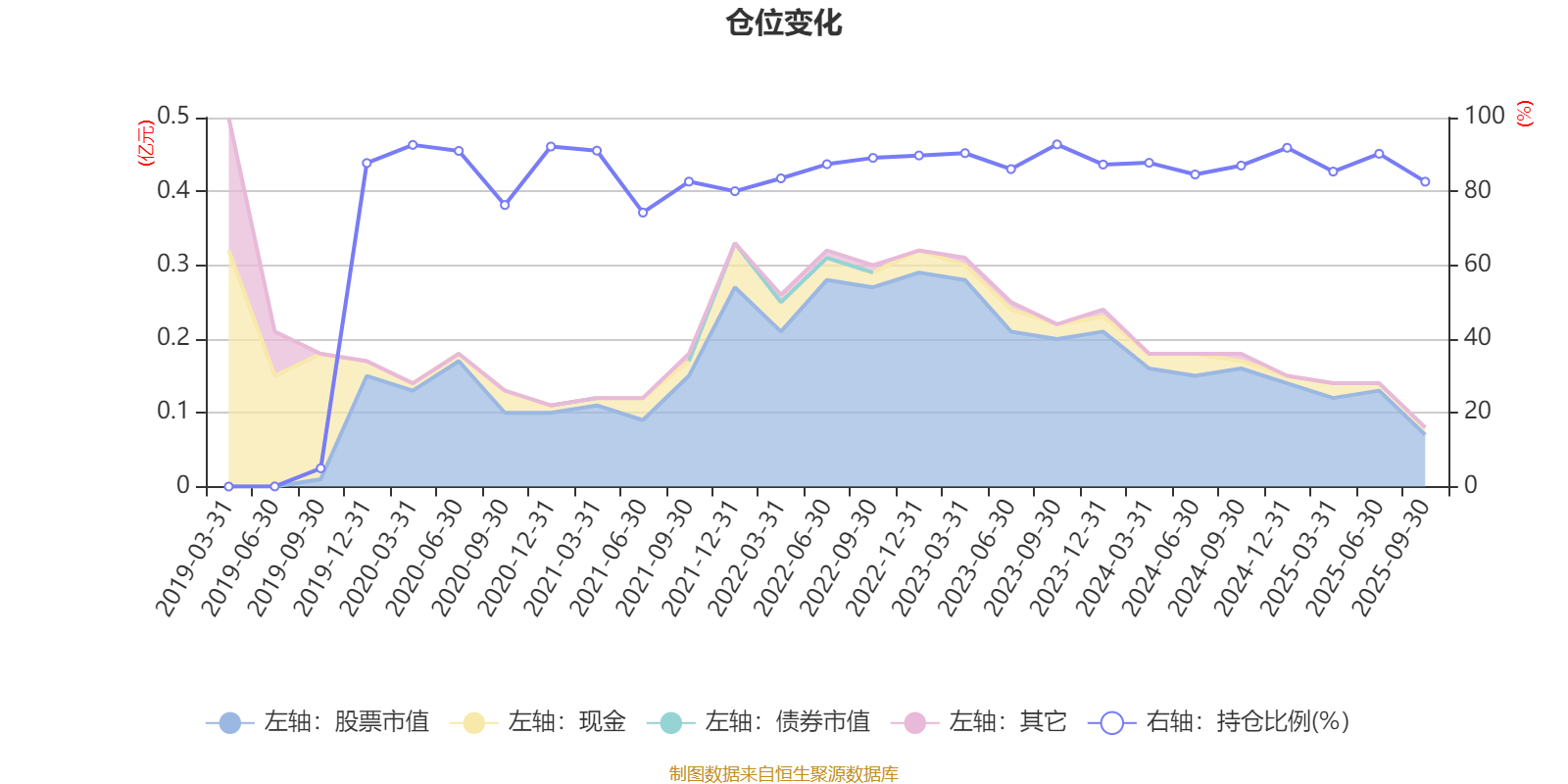 据定期报告数据统计,近三年平均股票仓位为87.96%,同类平均为72.35%。2023年三季度末基金达到92.74%的最高仓位,2019年上半年末最低,为0.04%。
