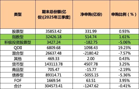天相投顾数据显示,截至2025年三季度末,各类型基金(含联接基金)期末总份额为30.46万亿份,比上季末减少1247.62亿份,降幅为0.41%。