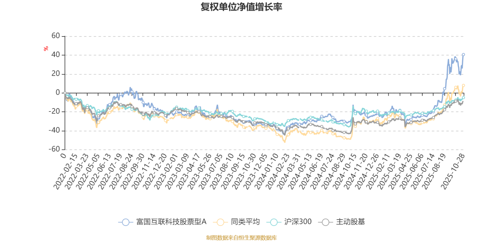 截至10月28日,富国互联科技股票型A近三个月复权单位净值增长率为58.72%,位于同类可比基金8/63;近半年复权单位净值增长率为93.13%,位于同类可比基金10/63;近一年复权单位净值增长率为78.23%,位于同类可比基金17/61;近三年复权单位净值增长率为65.84%,位于同类可比基金15/51。