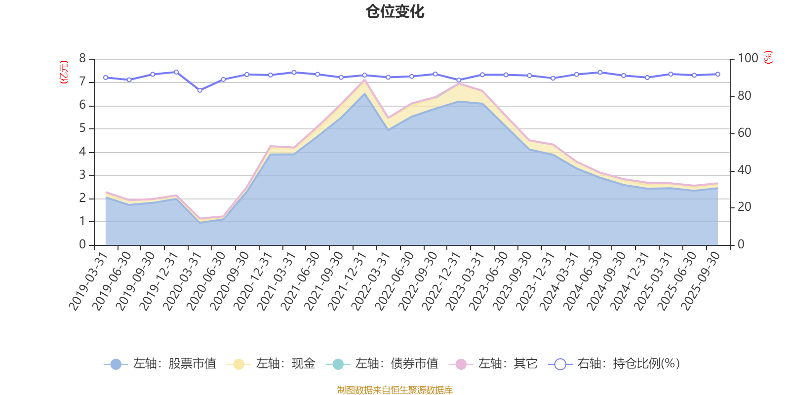 据定期报告数据统计,近三年平均股票仓位为91.23%,同类平均为88.27%。2019年末基金达到93.13%的最高仓位,2020年一季度末最低,为83.31%。