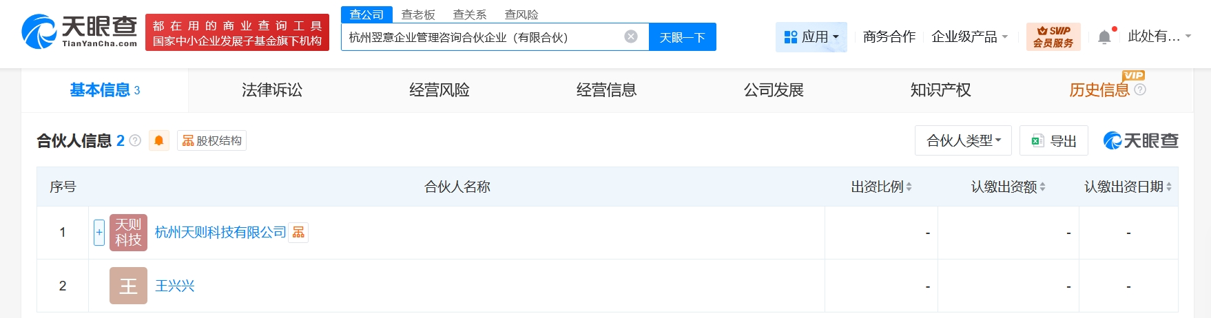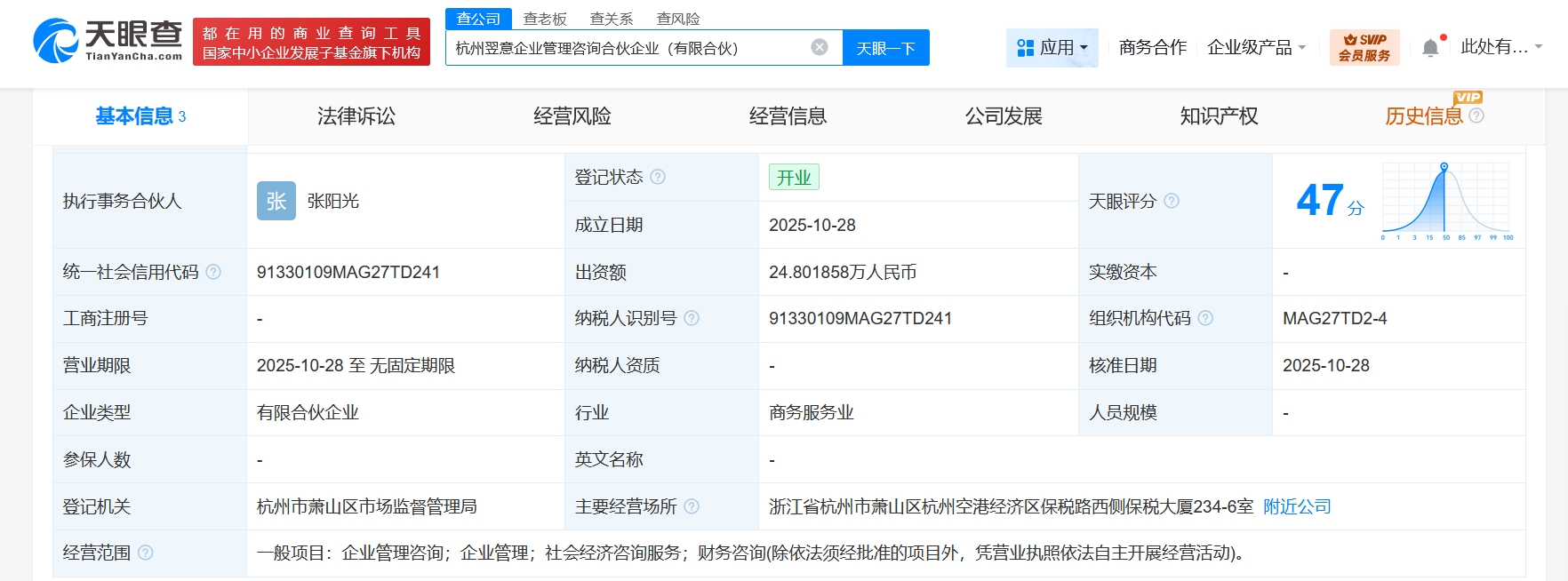 每经AI快讯,天眼查App显示,近日,杭州翌意企业管理咨询合伙企业(有限合伙)成立,执行事务合伙人为张阳光,出资额约24.8万元人民币,经营范围为企业管理咨询、企业管理、社会经济咨询服务、财务咨询。合伙人信息显示,该企业由王兴兴及名下杭州天则科技有限公司共同出资。