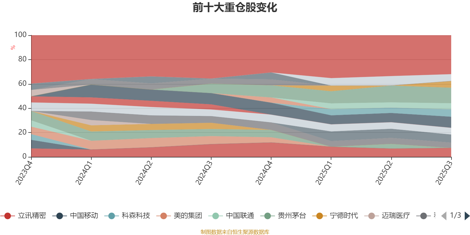 该基金持股集中度较高,近2年前十大重仓股集中度长期超过60%。截至2025年三季度末,基金十大重仓股分别是胜宏科技、恒瑞医药、立讯精密、火炬电子、歌尔股份、中兵红箭、豪威集团、拓普集团、北特科技、科伦药业。