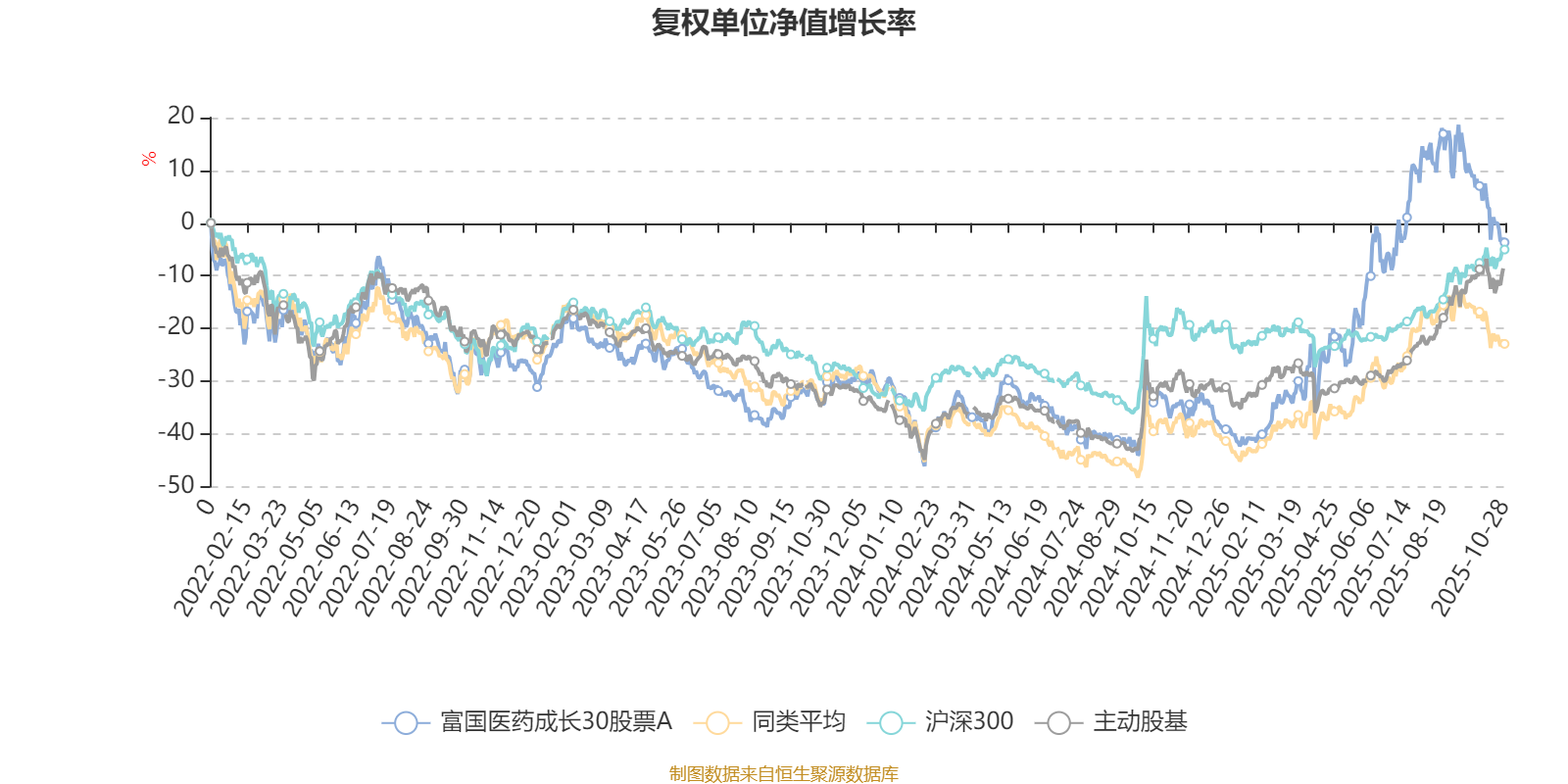截至10月28日,富国医药成长30股票A近三个月复权单位净值增长率为-13.91%,位于同类可比基金51/57;近半年复权单位净值增长率为23.85%,位于同类可比基金21/57;近一年复权单位净值增长率为44.01%,位于同类可比基金8/55;近三年复权单位净值增长率为34.35%,位于同类可比基金7/48。