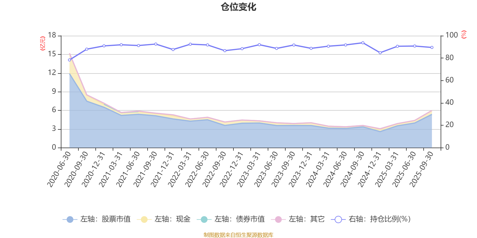据定期报告数据统计,近三年平均股票仓位为90.1%,同类平均为88.38%。2024年三季度末基金达到93.67%的最高仓位,2020年上半年末最低,为78.34%。