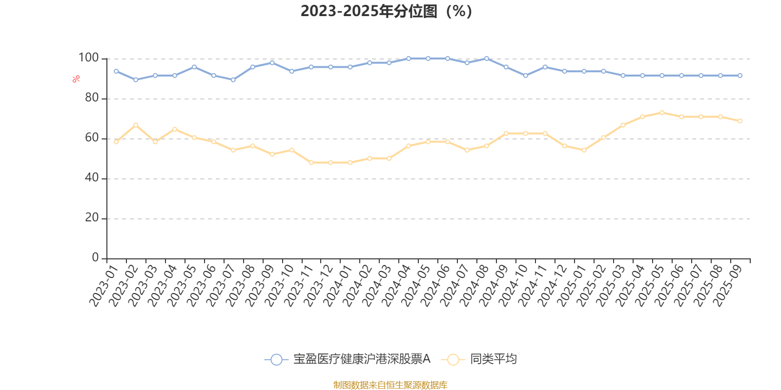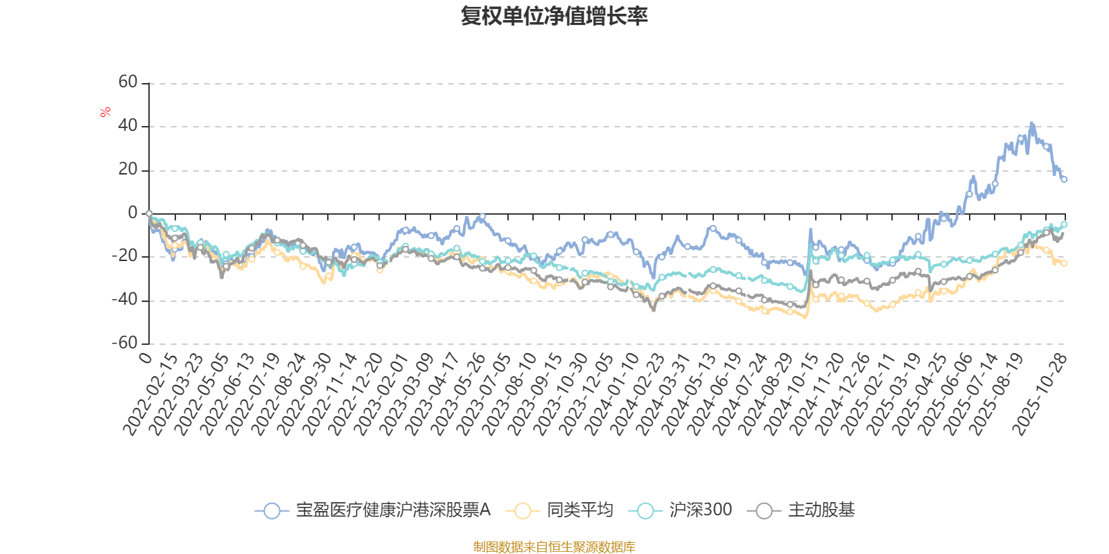 截至10月28日,宝盈医疗健康沪港深股票A近三个月复权单位净值增长率为-9.98%,位于同类可比基金47/57;近半年复权单位净值增长率为18.67%,位于同类可比基金37/57;近一年复权单位净值增长率为36.14%,位于同类可比基金13/55;近三年复权单位净值增长率为45.69%,位于同类可比基金6/48。