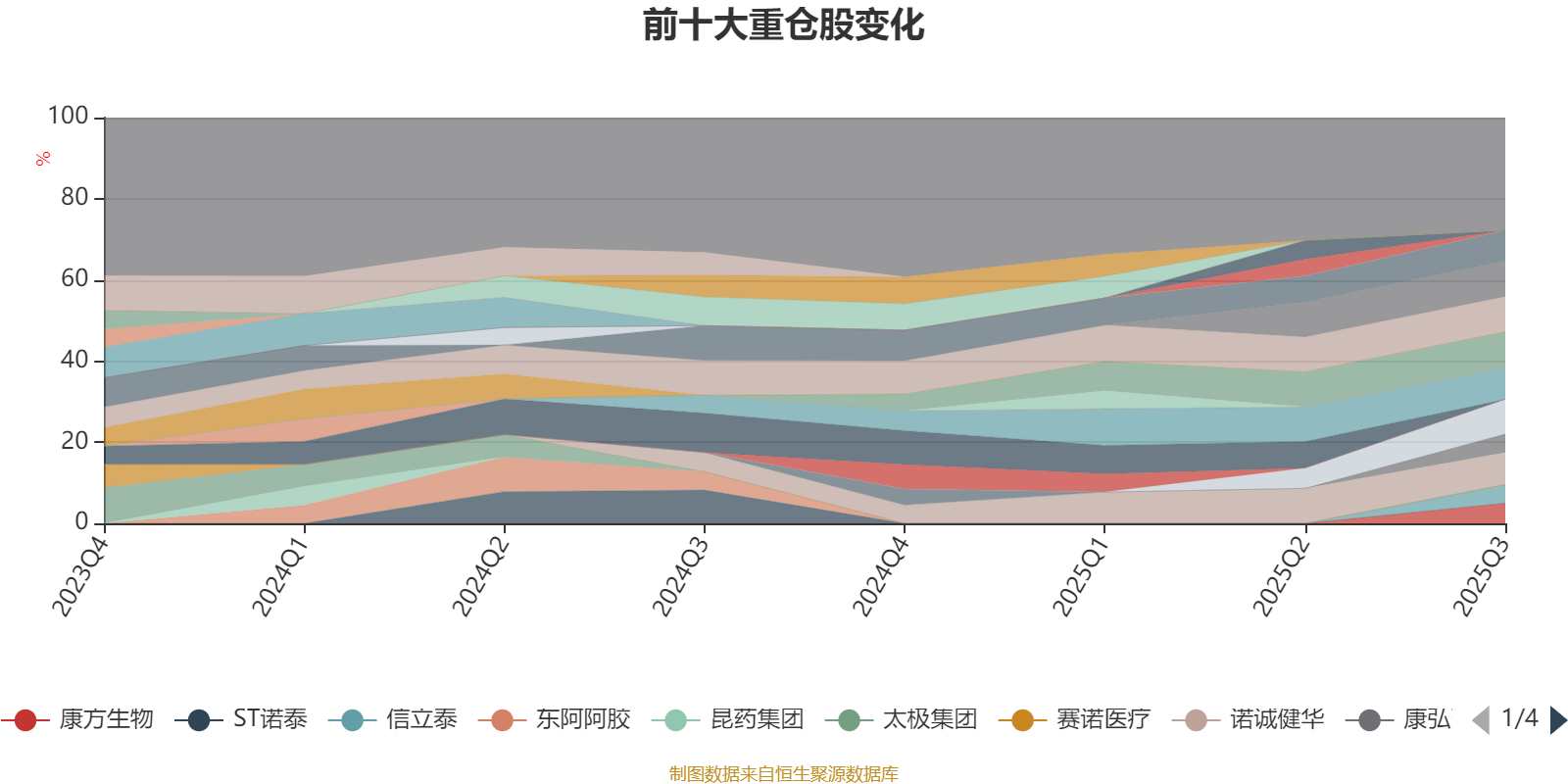 该基金持股集中度较高,近2年前十大重仓股集中度长期超过60%。截至2025年三季度末,基金十大重仓股分别是信达生物、科伦博泰生物-B、百利天恒、三生制药、诺诚健华、百济神州、恒瑞医药、康方生物、信立泰、康弘药业。