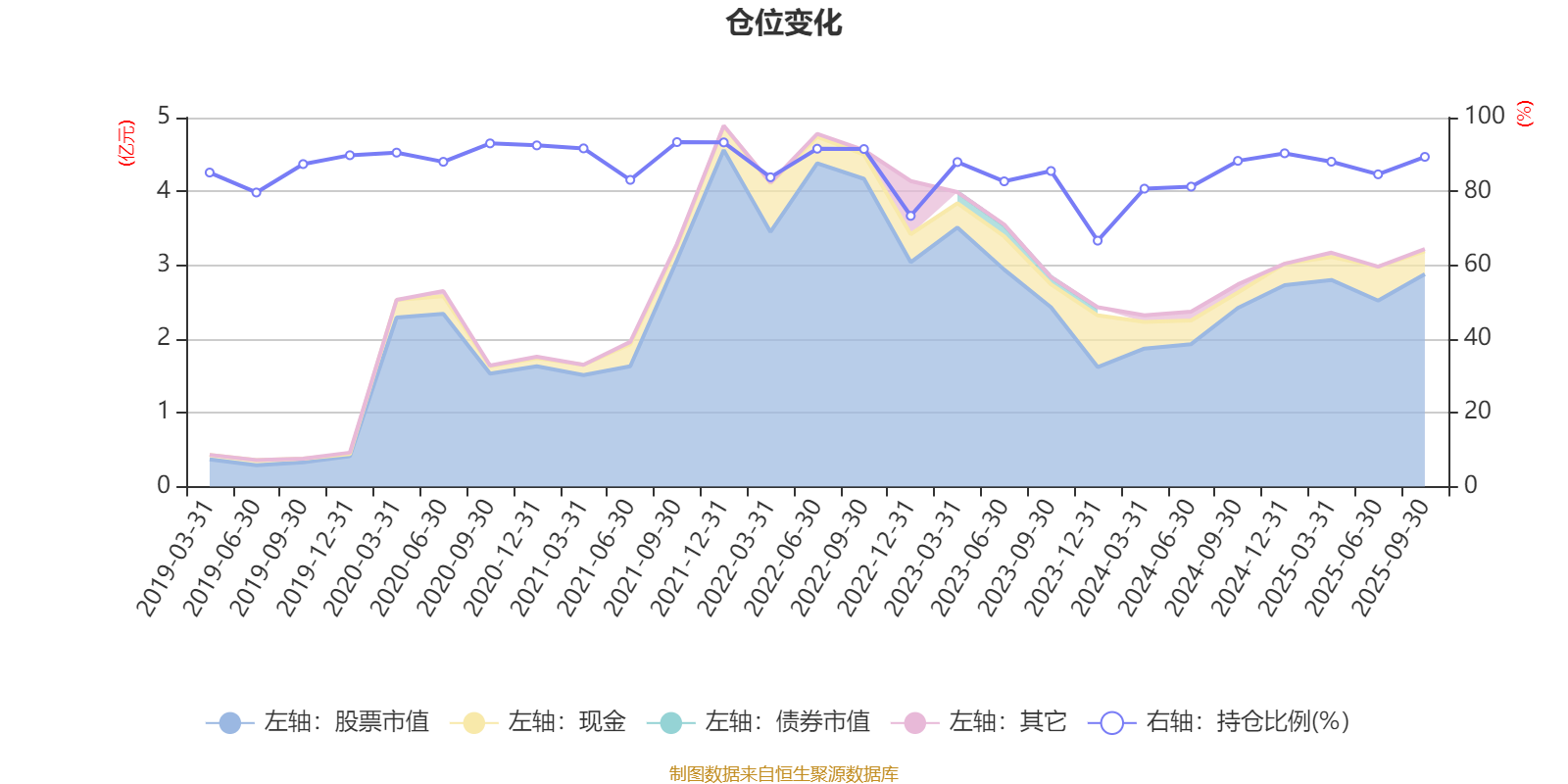 据定期报告数据统计,近三年平均股票仓位为83.24%,同类平均为72.35%。2021年三季度末基金达到93.36%的最高仓位,2023年末最低,为66.65%。