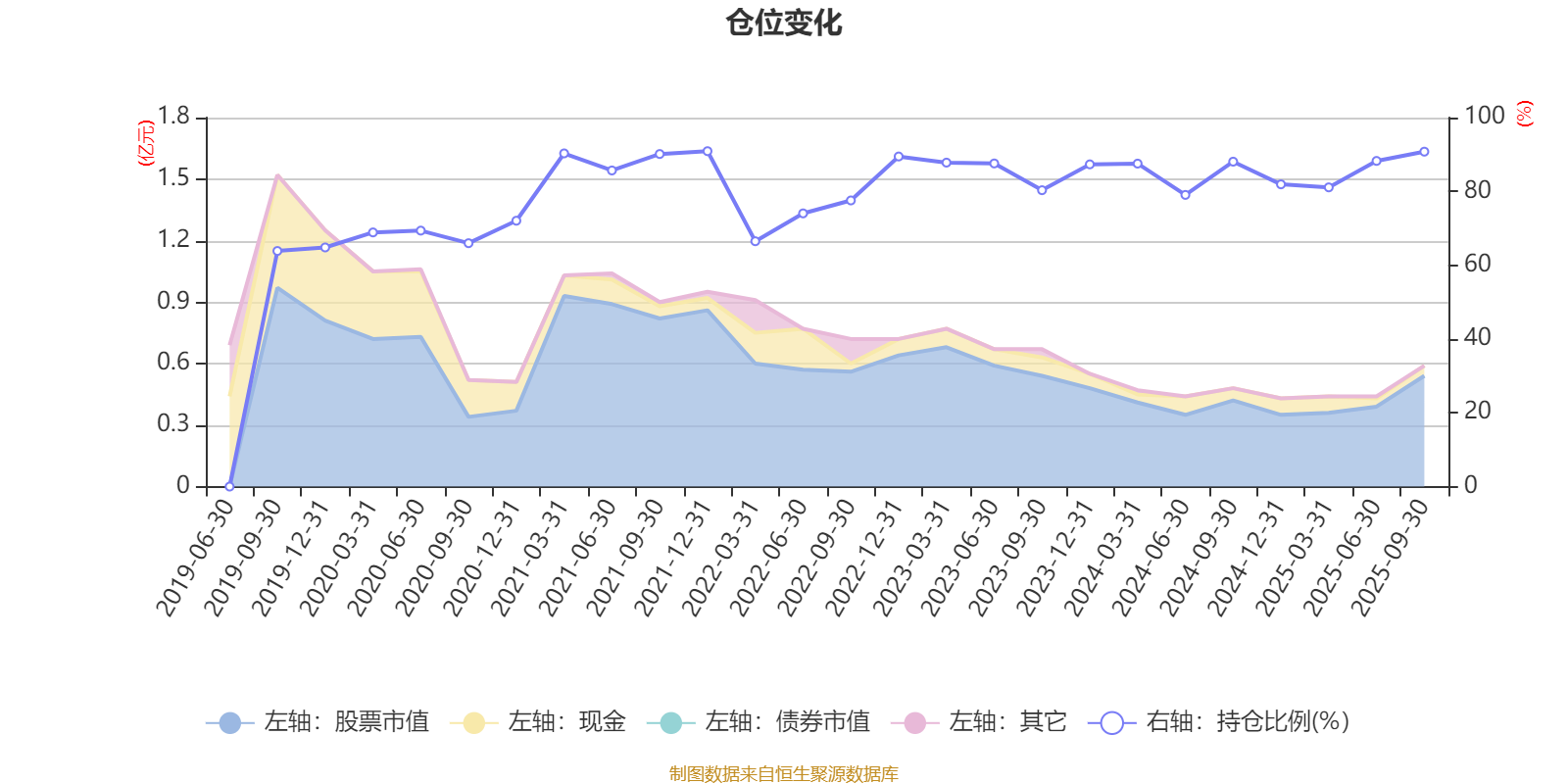 据定期报告数据统计,近三年平均股票仓位为85.76%,同类平均为83.73%。2021年末基金达到90.9%的最高仓位,2019年三季度末最低,为63.85%。
