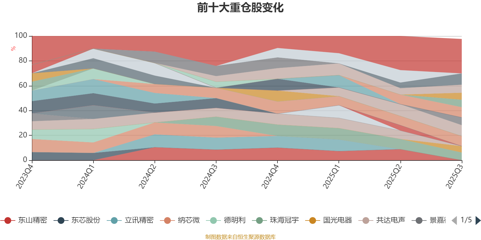 该基金持股集中度较高,近2年前十大重仓股集中度长期超过60%。截至2025年三季度末,基金十大重仓股分别是中科蓝讯、中芯国际、华虹半导体、舜宇光学科技、蓝思科技、珠海冠宇、康耐特光学、长盈精密、龙旗科技、国光电器。
