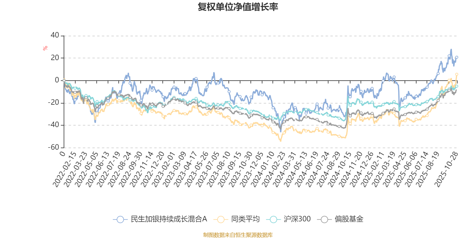 截至10月28日,民生加银持续成长混合A近三个月复权单位净值增长率为20.47%,位于同类可比基金179/229;近半年复权单位净值增长率为43.94%,位于同类可比基金150/229;近一年复权单位净值增长率为31.45%,位于同类可比基金189/213;近三年复权单位净值增长率为37.70%,位于同类可比基金90/158。