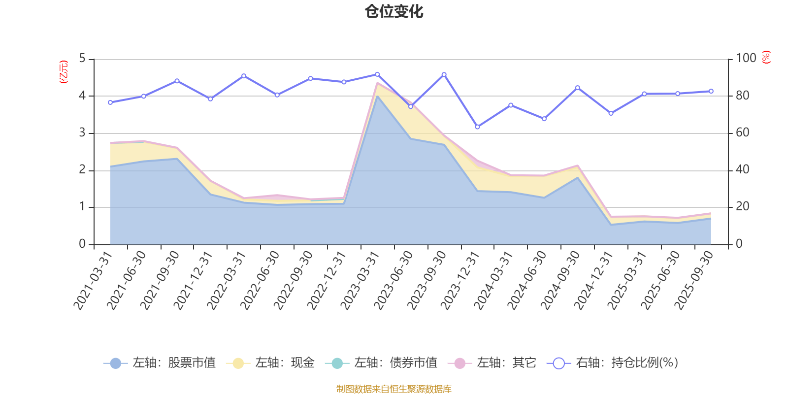 据定期报告数据统计,近三年平均股票仓位为79.39%,同类平均为72.35%。2023年一季度末基金达到91.79%的最高仓位,2023年末最低,为63.46%。