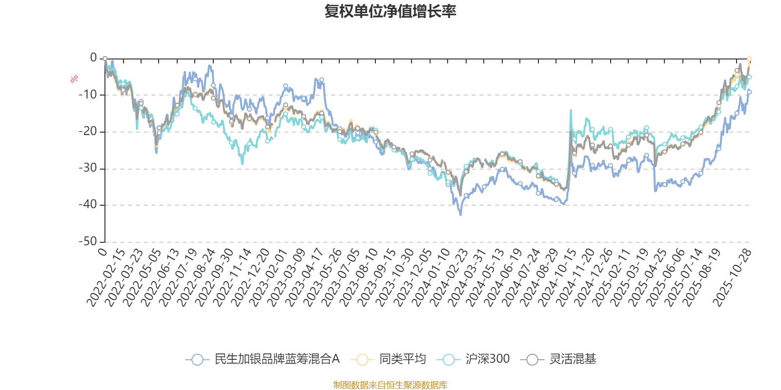 截至10月28日,民生加银品牌蓝筹混合A近三个月复权单位净值增长率为25.07%,位于同类可比基金268/1287;近半年复权单位净值增长率为39.48%,位于同类可比基金286/1287;近一年复权单位净值增长率为28.07%,位于同类可比基金475/1287;近三年复权单位净值增长率为5.17%,位于同类可比基金905/1286。