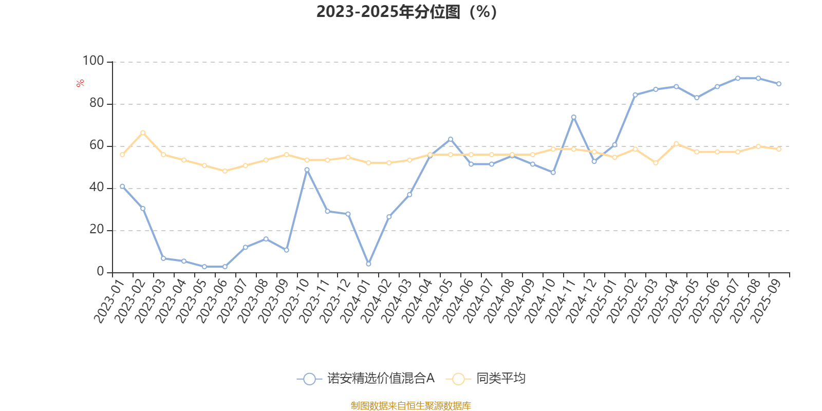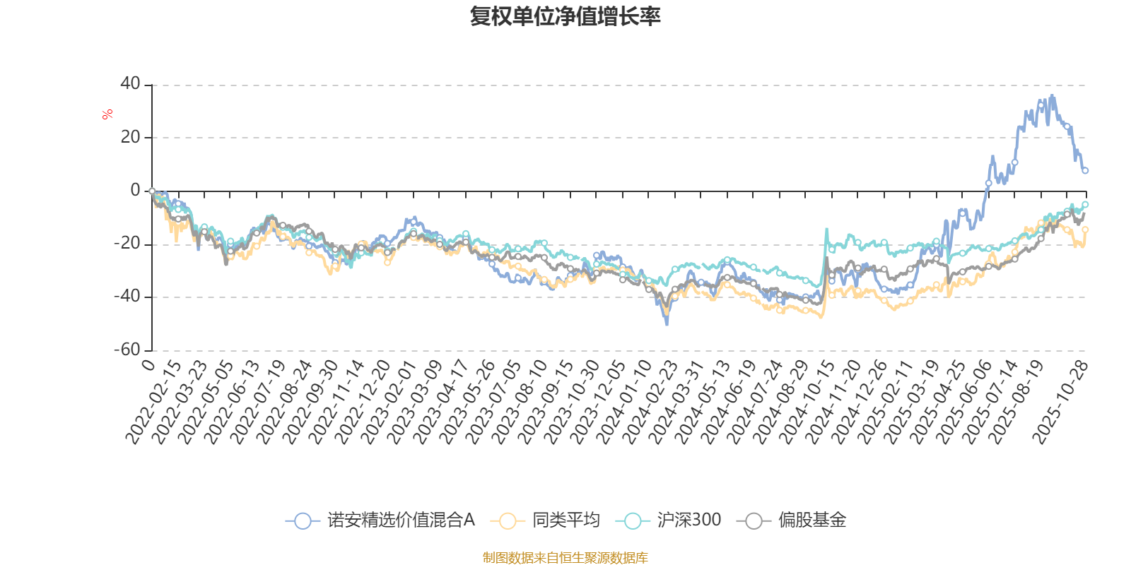 截至10月28日,诺安精选价值混合A近三个月复权单位净值增长率为-14.34%,位于同类可比基金97/106;近半年复权单位净值增长率为17.84%,位于同类可比基金70/104;近一年复权单位净值增长率为56.59%,位于同类可比基金7/101;近三年复权单位净值增长率为47.74%,位于同类可比基金8/75。
