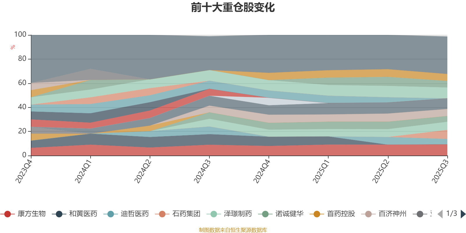 该基金持股集中度较高,近2年前十大重仓股集中度长期超过60%。截至2025年三季度末,基金十大重仓股分别是康方生物、信达生物、科伦博泰生物-B、石药集团、泽璟制药、百济神州、益方生物、新诺威、诺诚健华、迪哲医药。