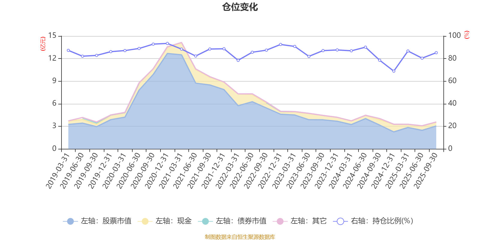 据定期报告数据统计,近三年平均股票仓位为84.73%,同类平均为72.35%。2020年末基金达到93.43%的最高仓位,2024年末最低,为68.91%。