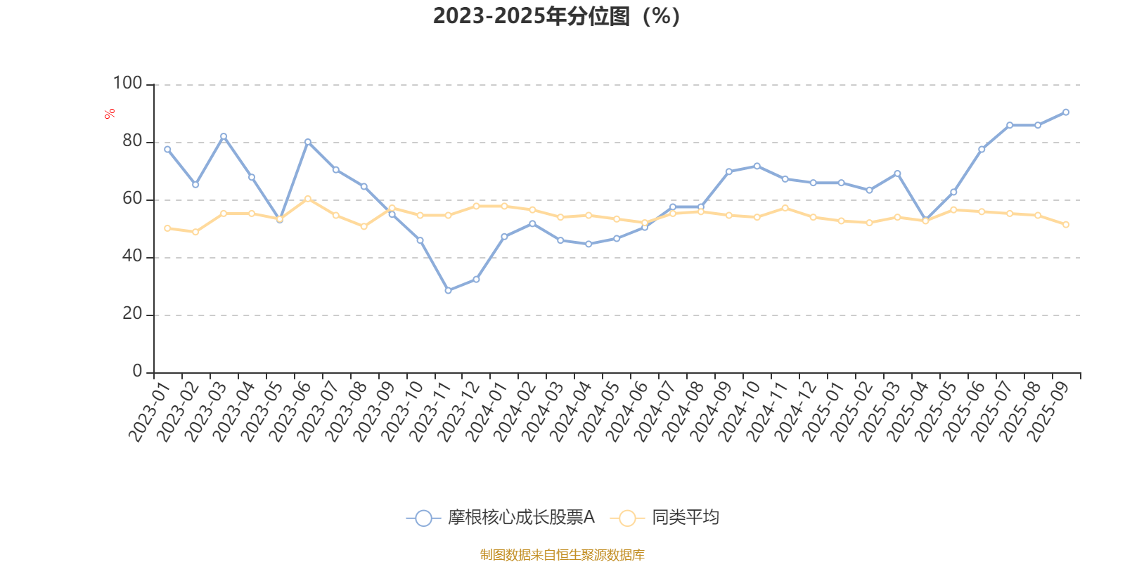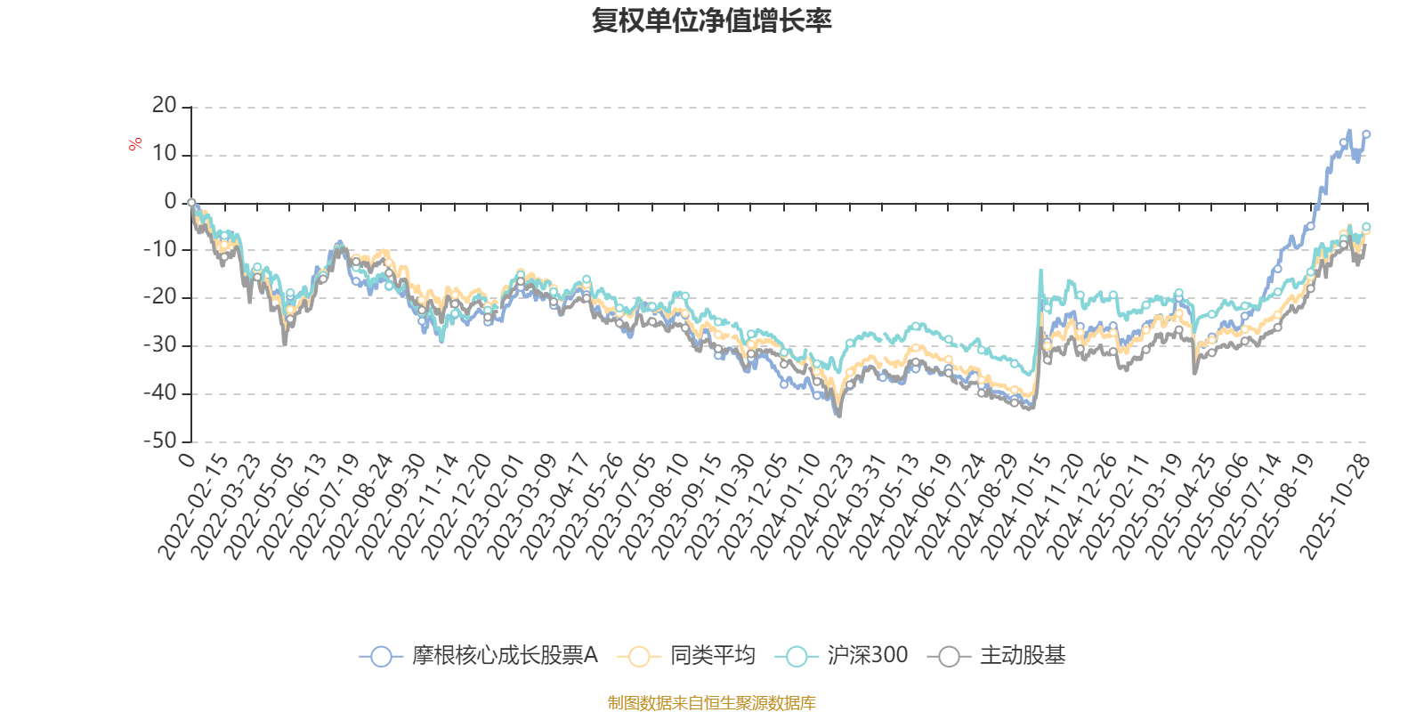 截至10月28日,摩根核心成长股票A近三个月复权单位净值增长率为23.77%,位于同类可比基金38/167;近半年复权单位净值增长率为60.19%,位于同类可比基金9/166;近一年复权单位净值增长率为50.95%,位于同类可比基金16/164;近三年复权单位净值增长率为61.16%,位于同类可比基金19/156。