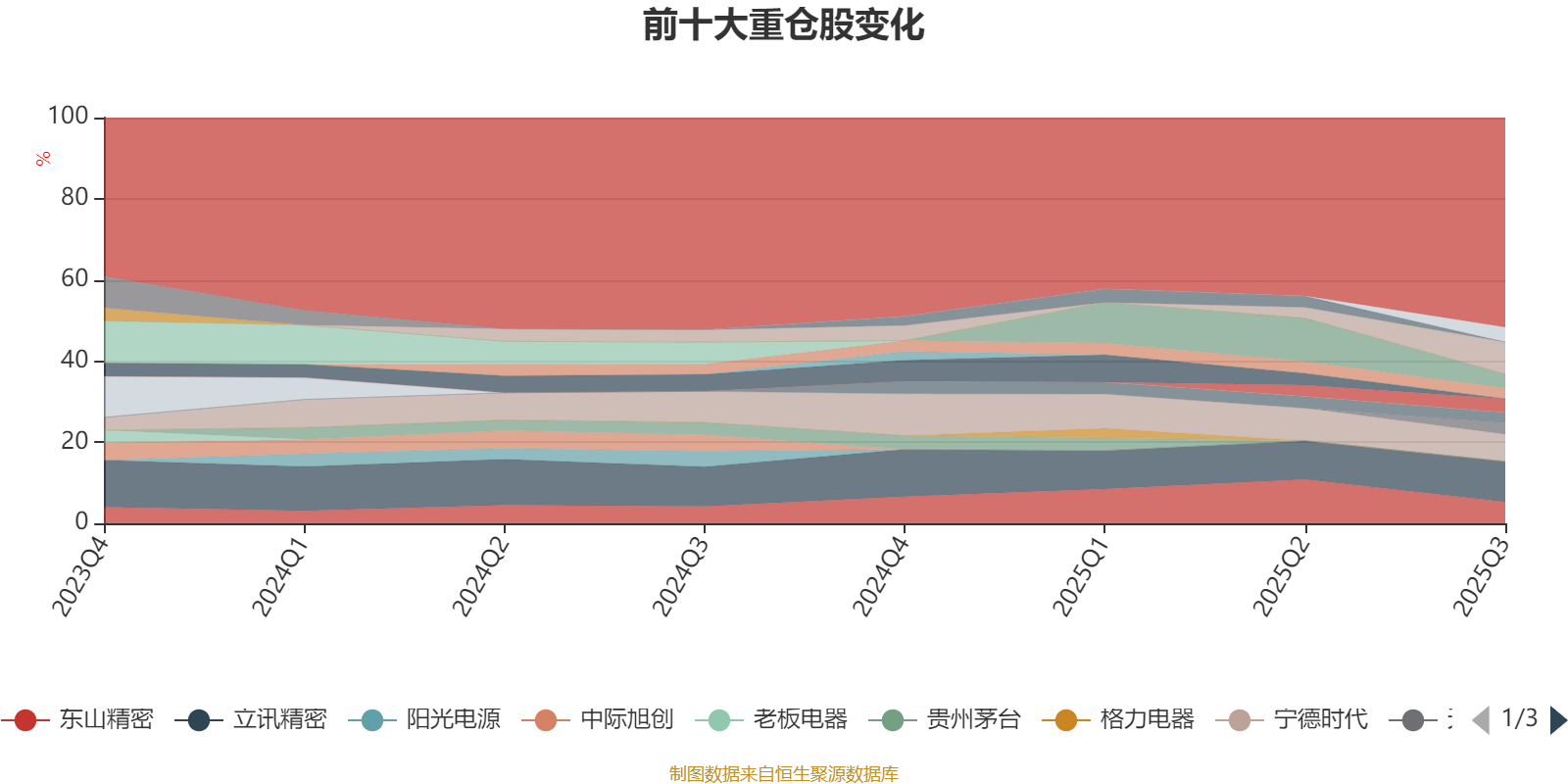 截至2025年三季度末,基金十大重仓股分别是立讯精密、亿纬锂能、宁德时代、东山精密、恩捷股份、胜宏科技、徐工机械、天赐材料、牧原股份、招商银行。