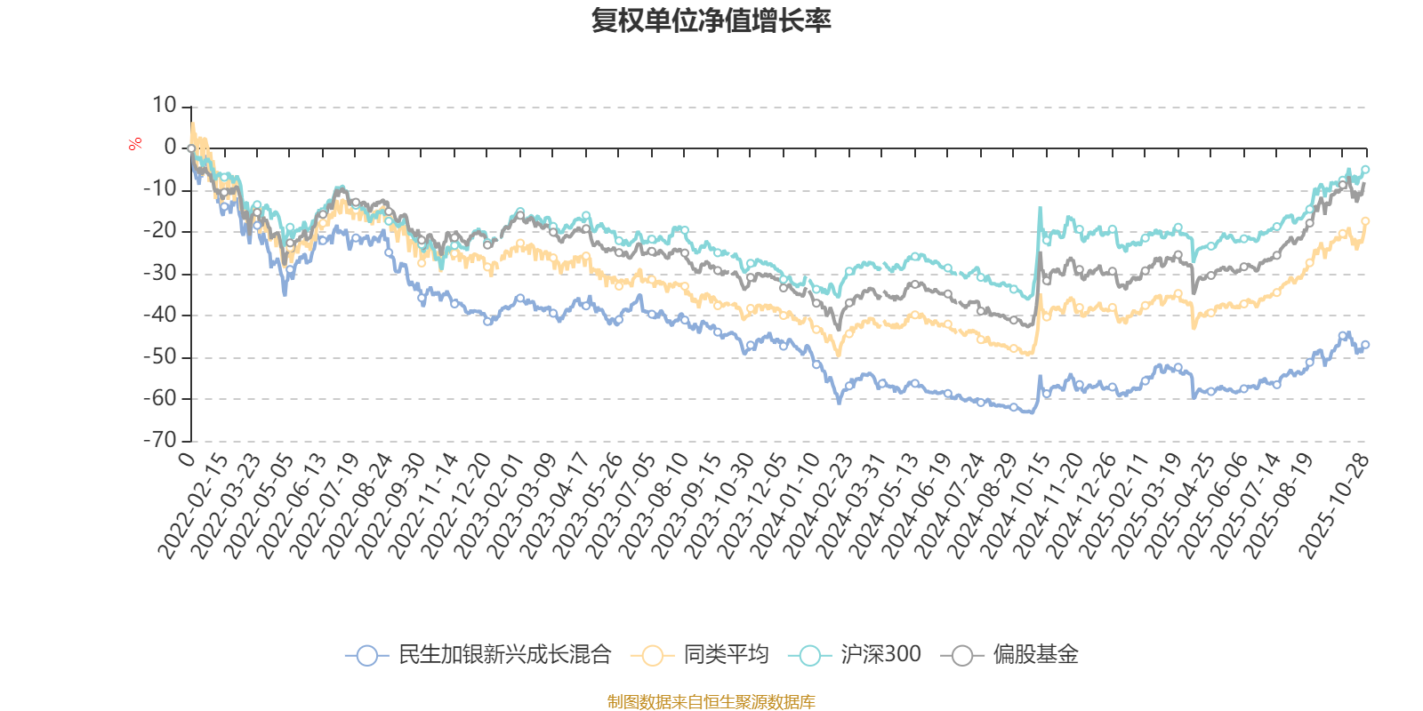 截至10月28日,民生加银新兴成长混合近三个月复权单位净值增长率为13.80%,位于同类可比基金324/621;近半年复权单位净值增长率为27.07%,位于同类可比基金348/619;近一年复权单位净值增长率为22.33%,位于同类可比基金377/611;近三年复权单位净值增长率为-16.34%,位于同类可比基金496/518。