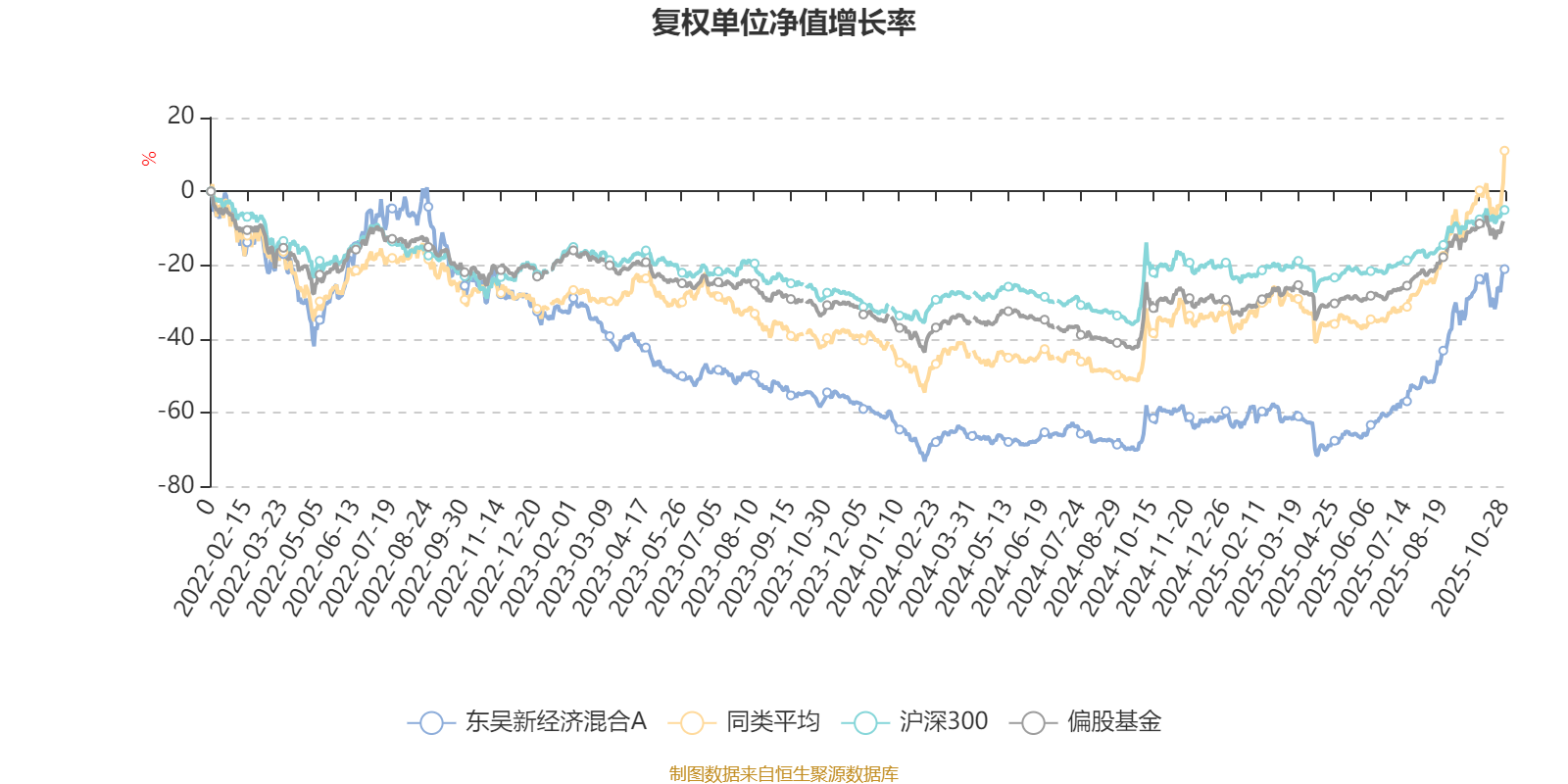 截至10月28日,东吴新经济混合A近三个月复权单位净值增长率为65.17%,位于同类可比基金13/229;近半年复权单位净值增长率为147.97%,位于同类可比基金4/229;近一年复权单位净值增长率为95.53%,位于同类可比基金23/213;近三年复权单位净值增长率为12.94%,位于同类可比基金143/158。