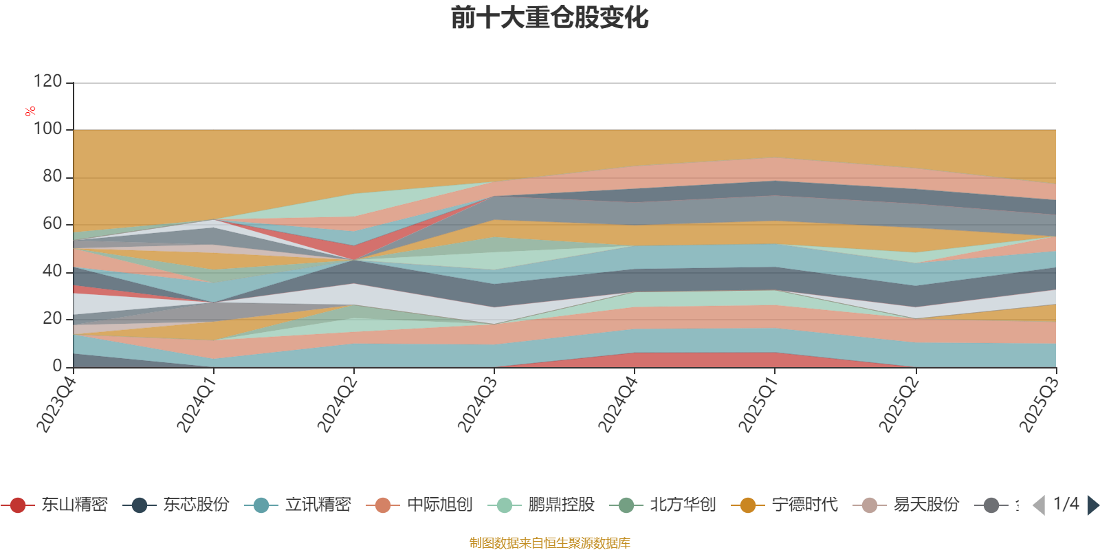 该基金持股集中度较高。截至2025年三季度末,基金十大重仓股分别是立讯精密、歌尔股份、中际旭创、新易盛、宁德时代、沪电股份、水晶光电、蓝思科技、豪威集团、德赛西威。